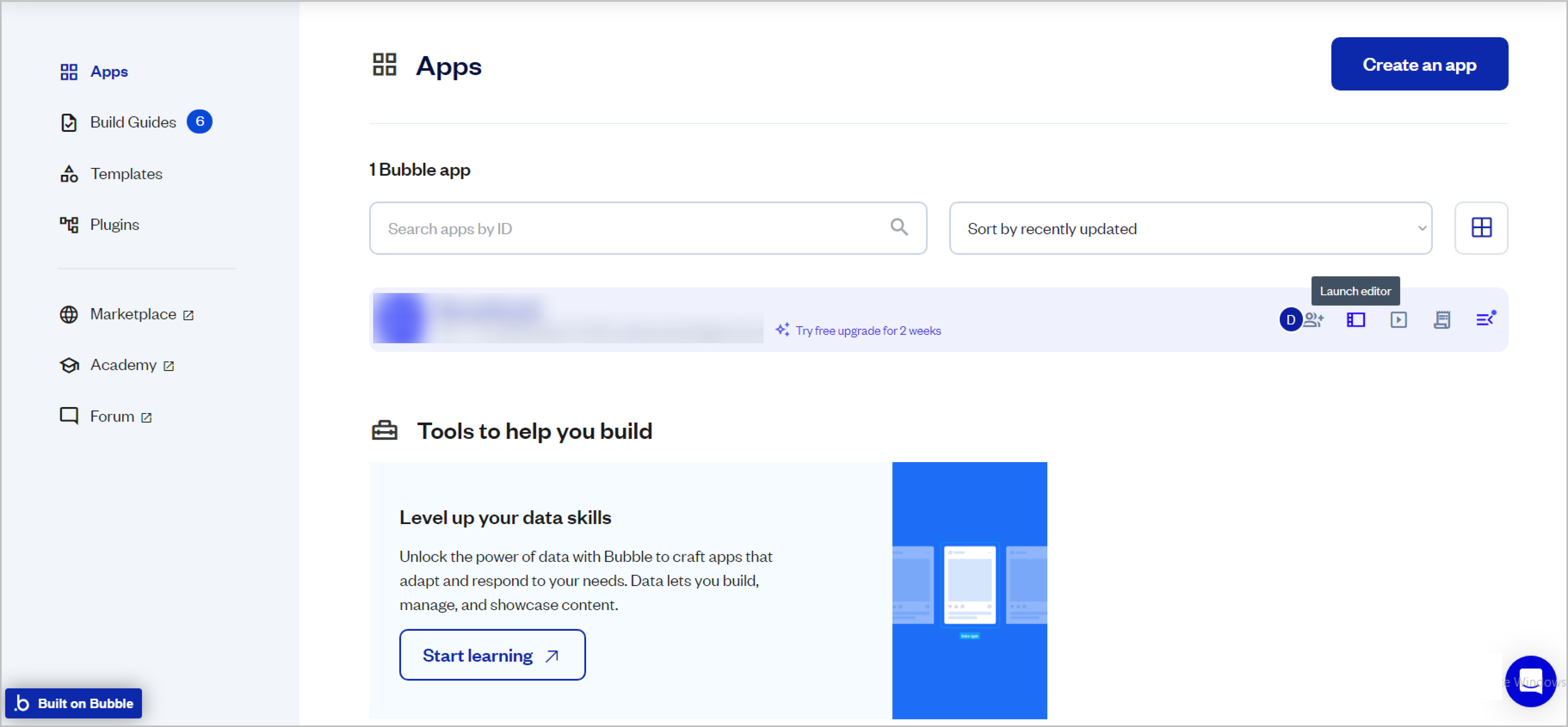 - Click on the Launch editor button inside the bubble app . Upon clicking Bubble app editor will be opened.