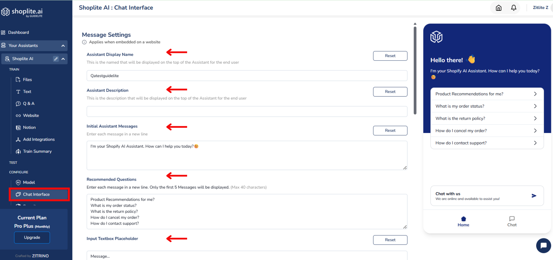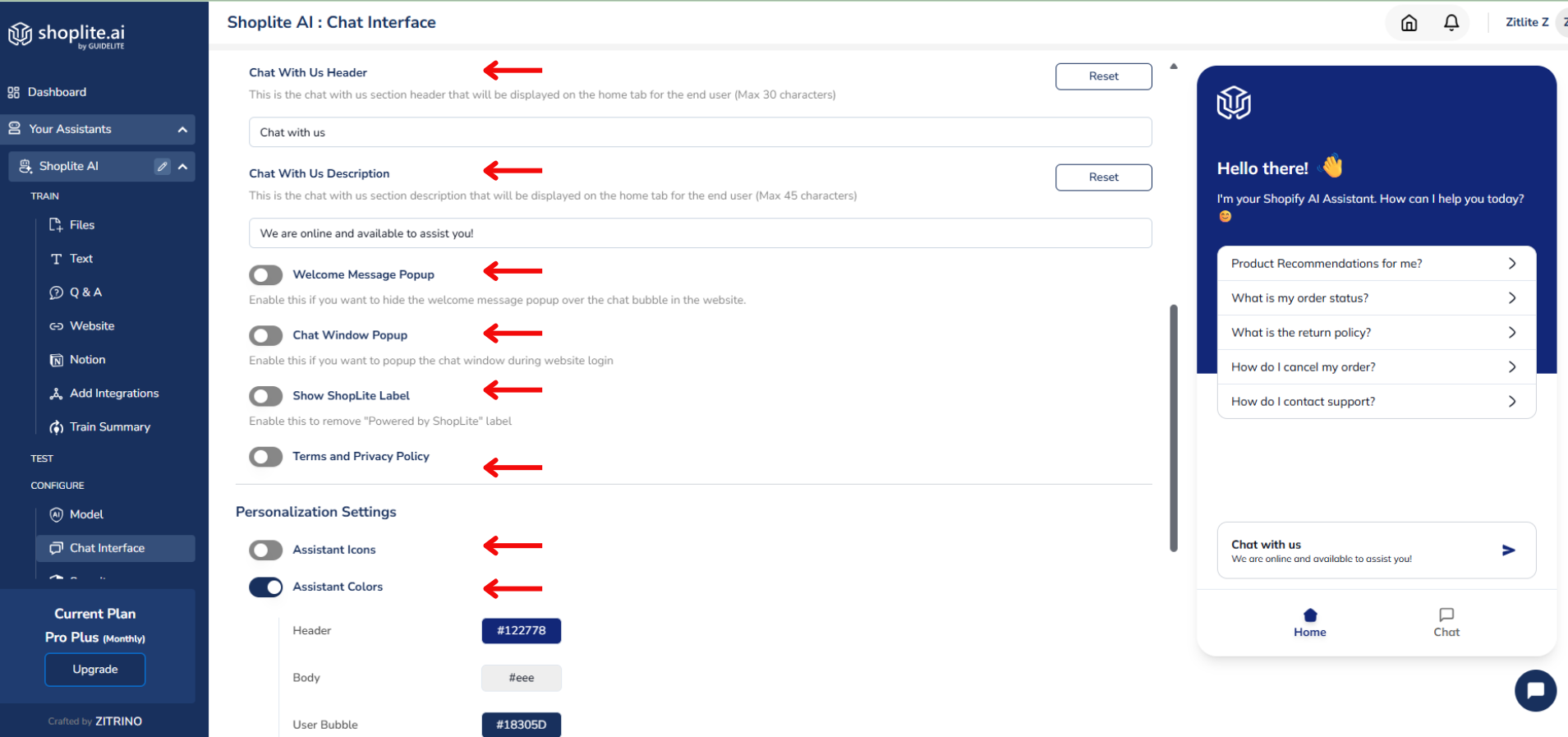 - Show ShopLite Label: Enable this option to remove the ShopLite label from your AI Assistant. Available exclusively with the Harvest plan.