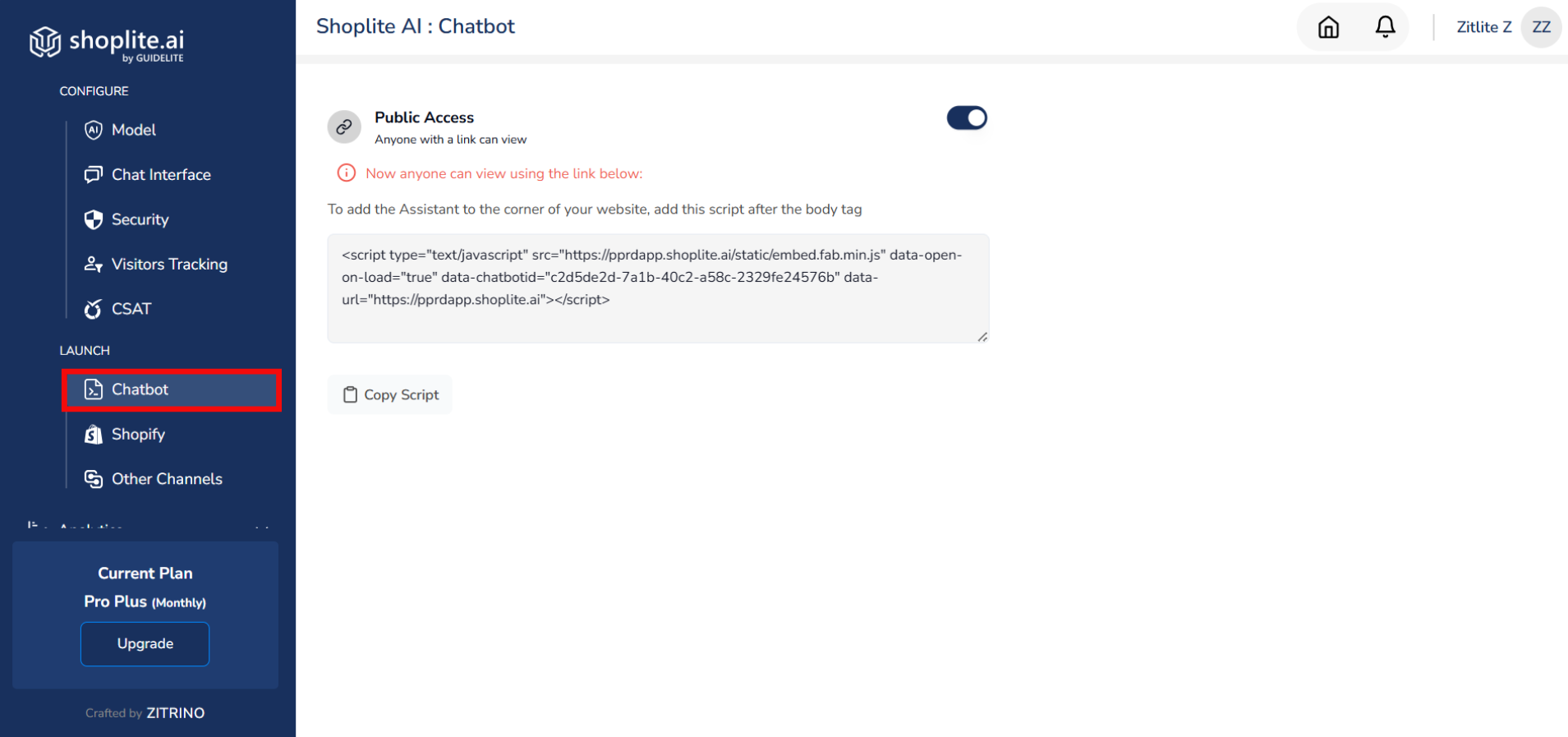 2. Select Chabot and copy the script by clicking on the Copy Script button.
