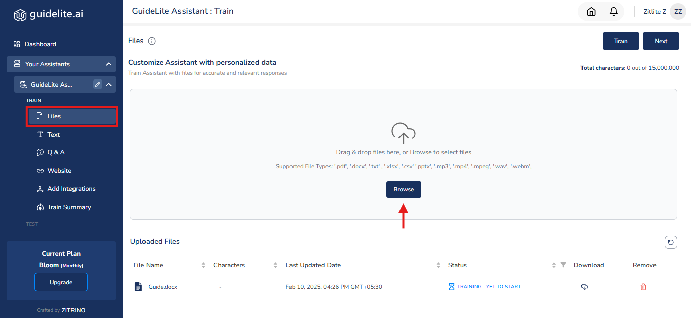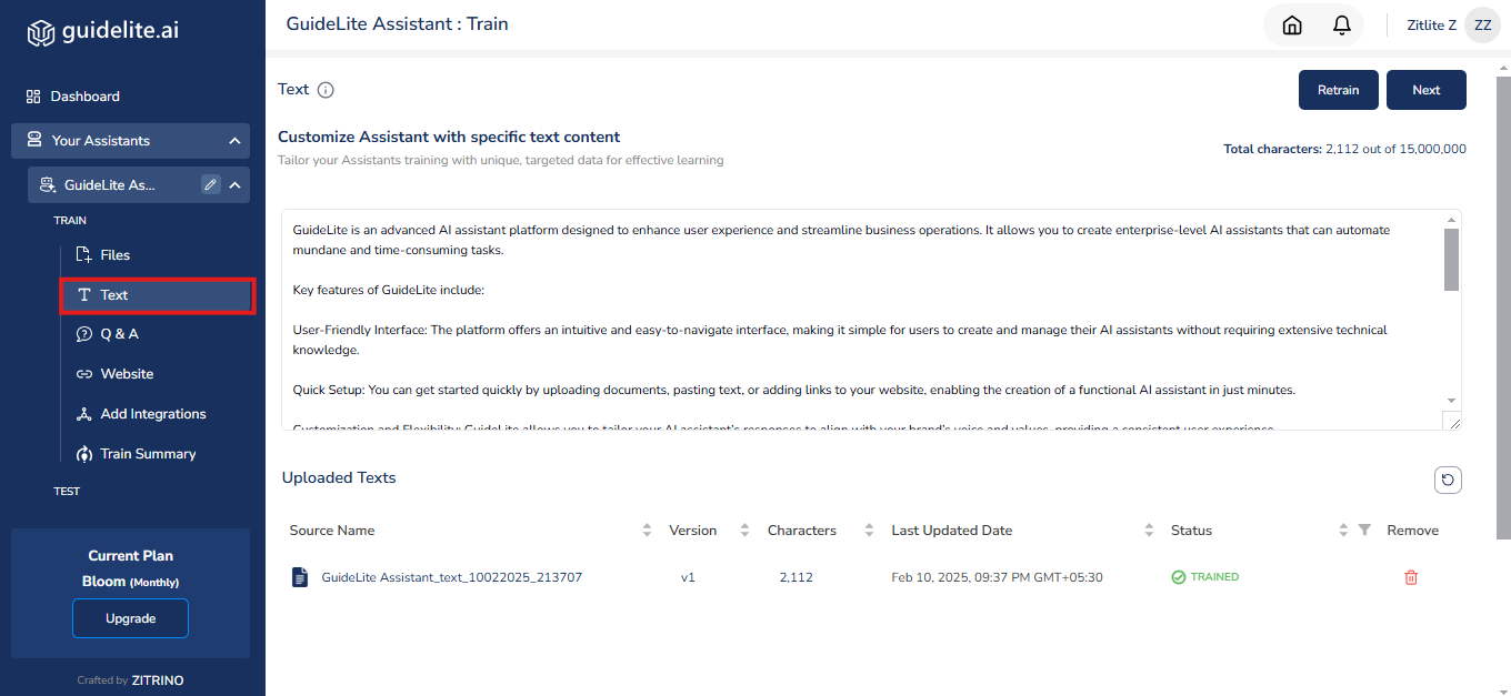 In GuideLite, you can Train your Assistant by providing the following sources. Here “sources” refer to the data that you provide to train your Assistant.