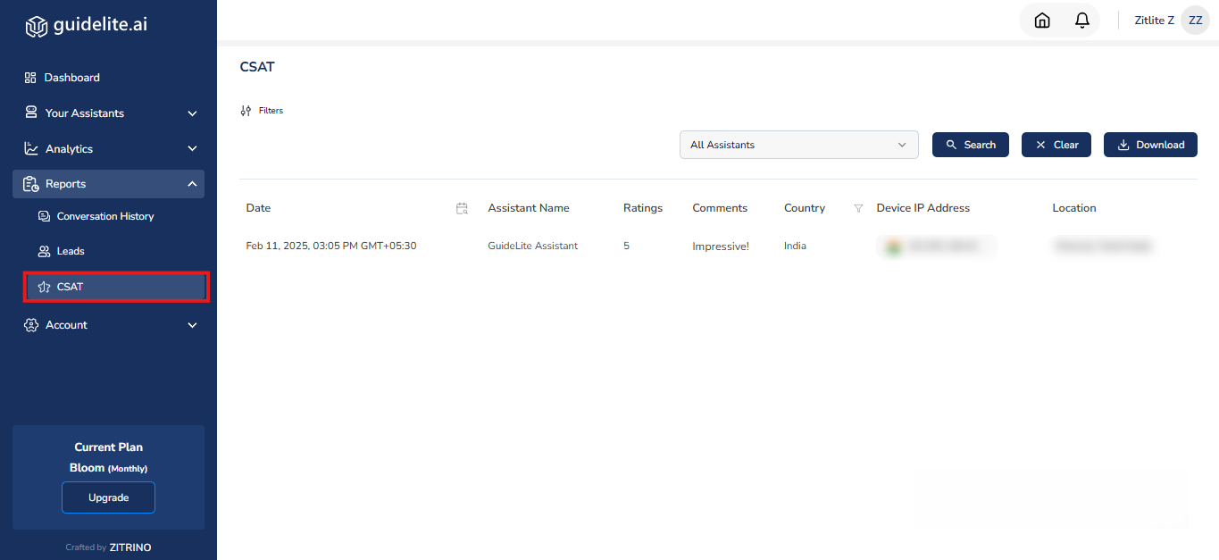 You can access CSAT information, with options to filter by date ranges and country, and download the data as needed.