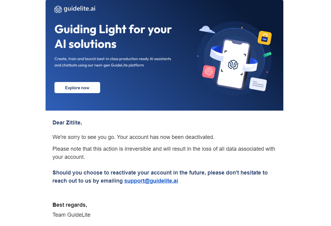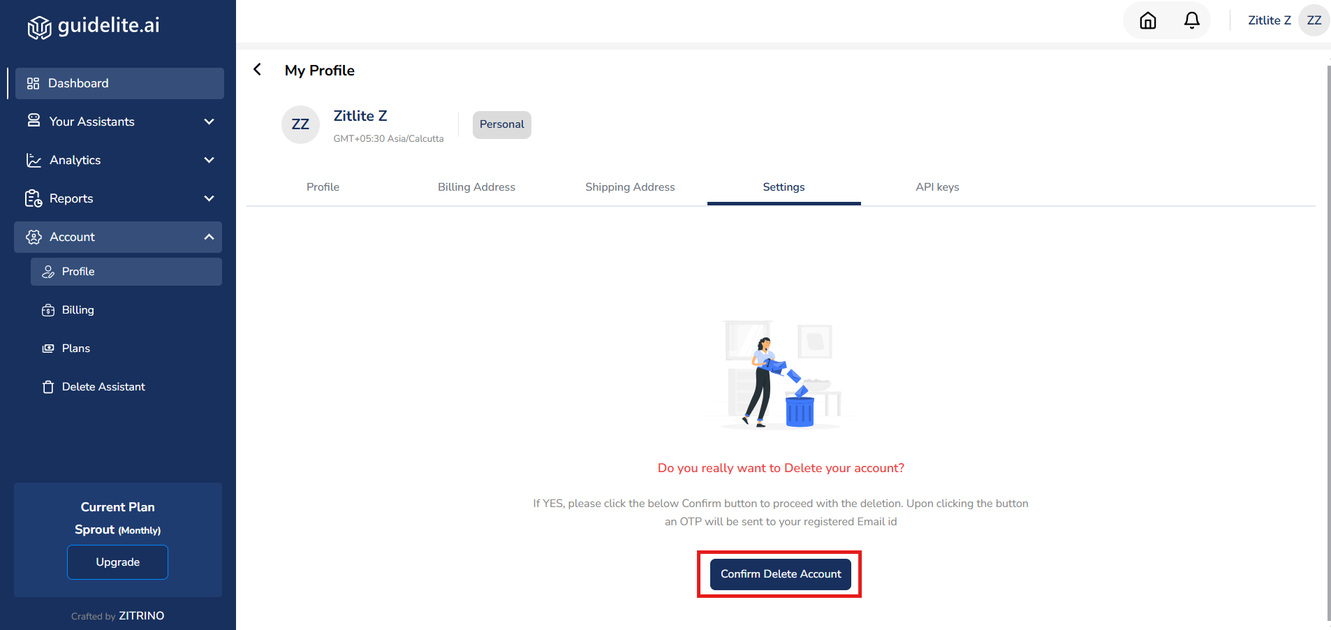 Click on Delete Account, then confirm the deletion on the next page. An OTP will be sent to the email address registered with your account.