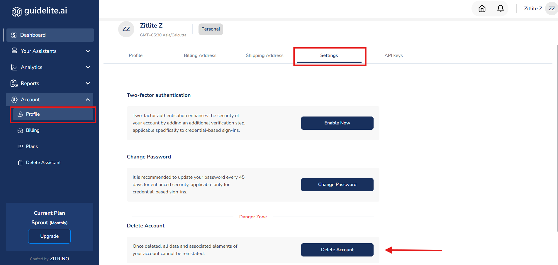 From your dashboard, go to the Profile section in the Account menu and navigate to Settings tab.