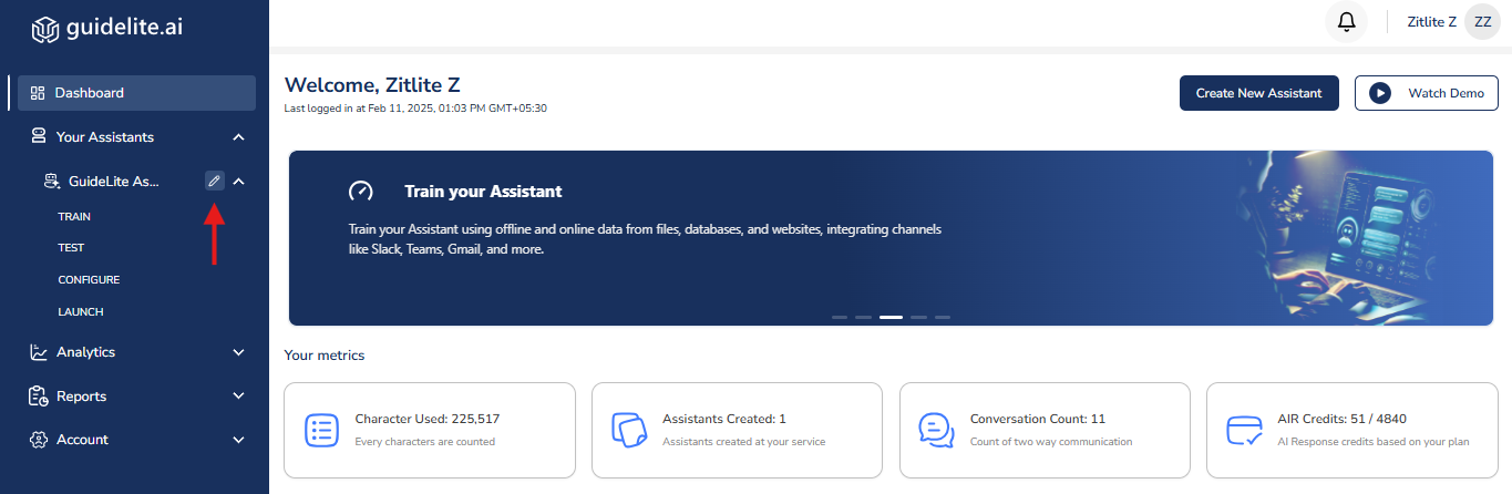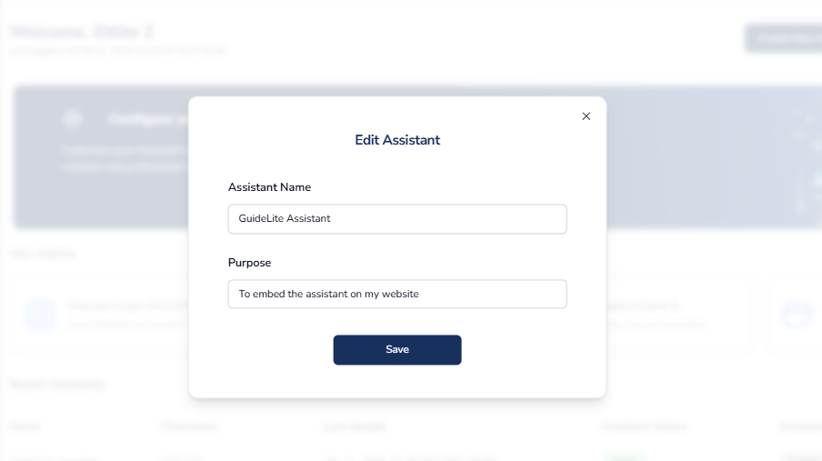 GuideLite provides you access to change the Name and Purpose of the Assistant that has been created.