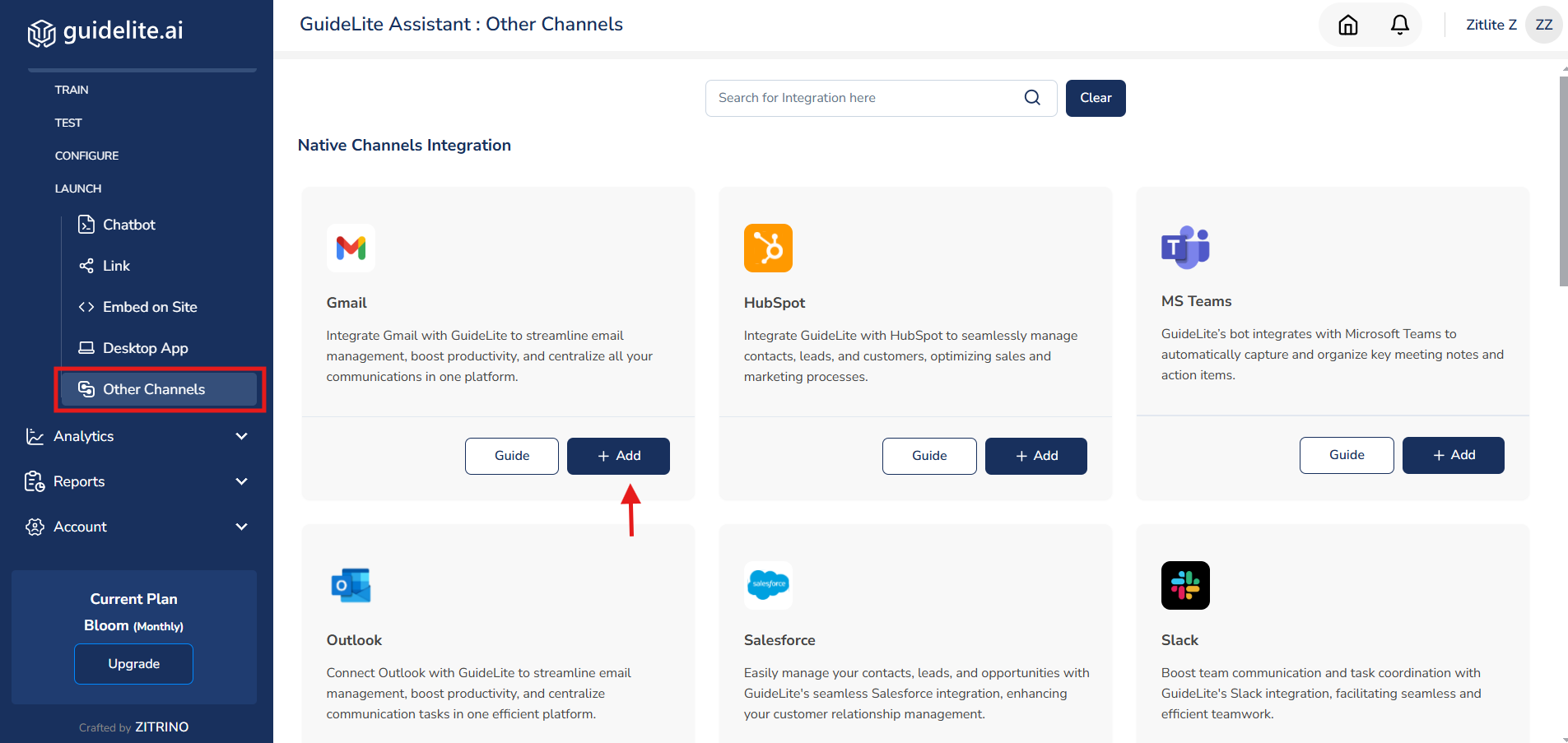 - In the Launch section, locate Other Channels and click the Add button on the Gmail card..