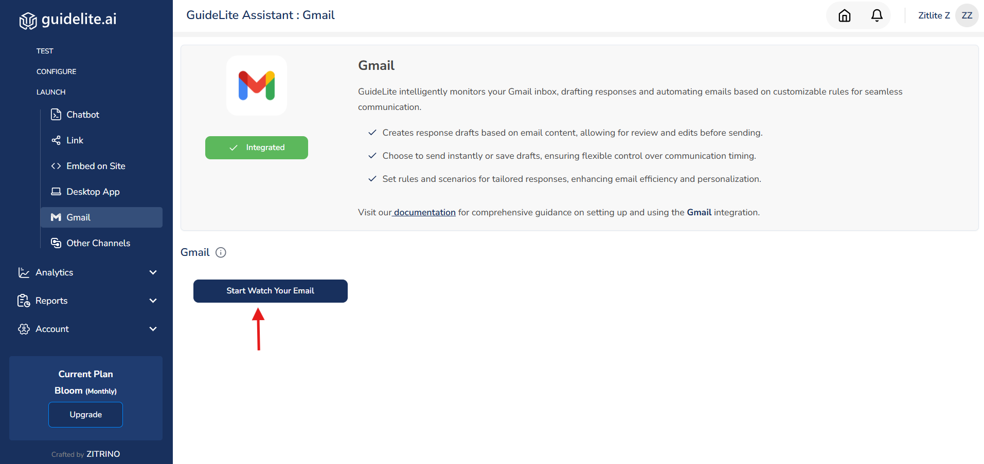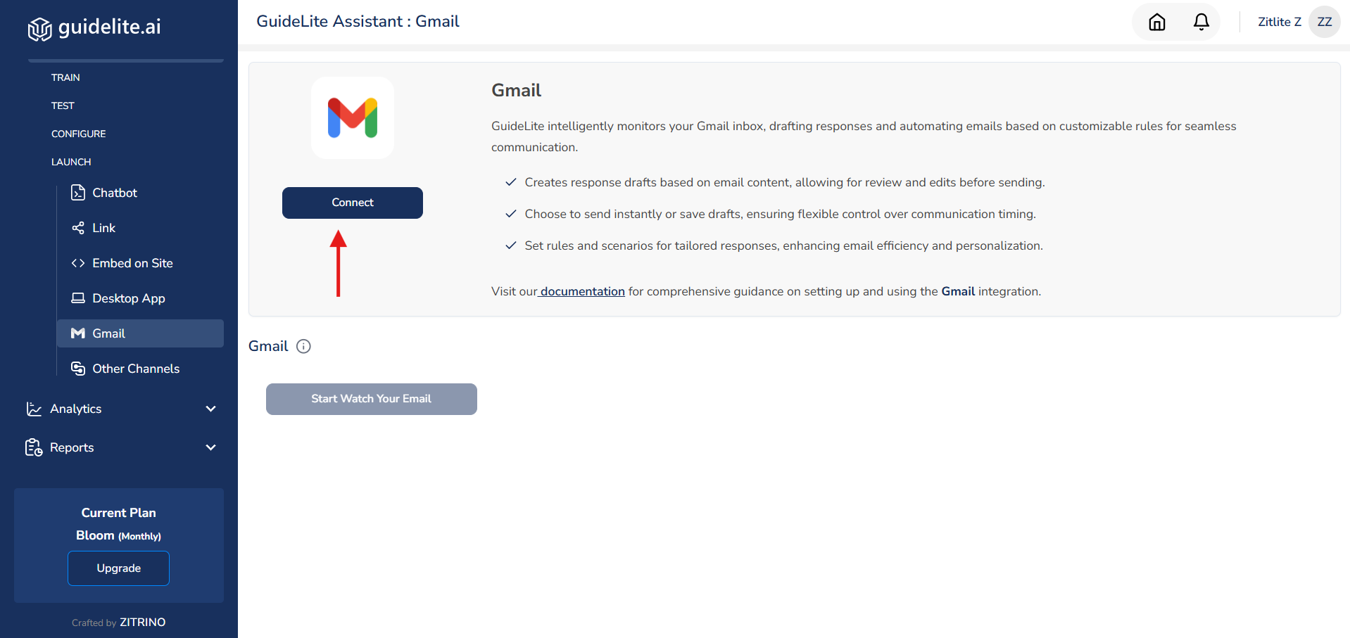 - Once the connection is established, Click on "start watch your email" to allow GuideLite to start watching your inbox for new emails.
