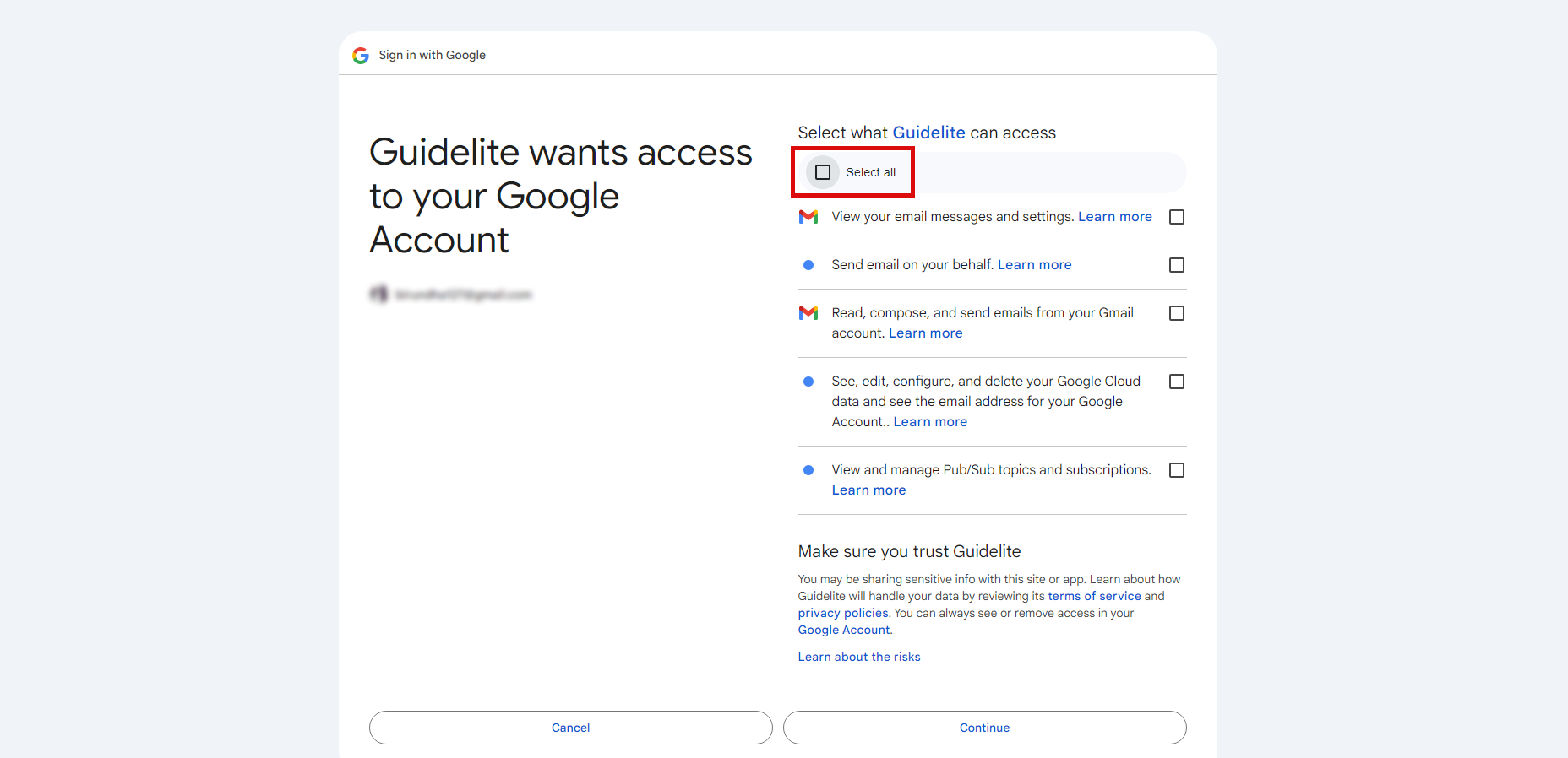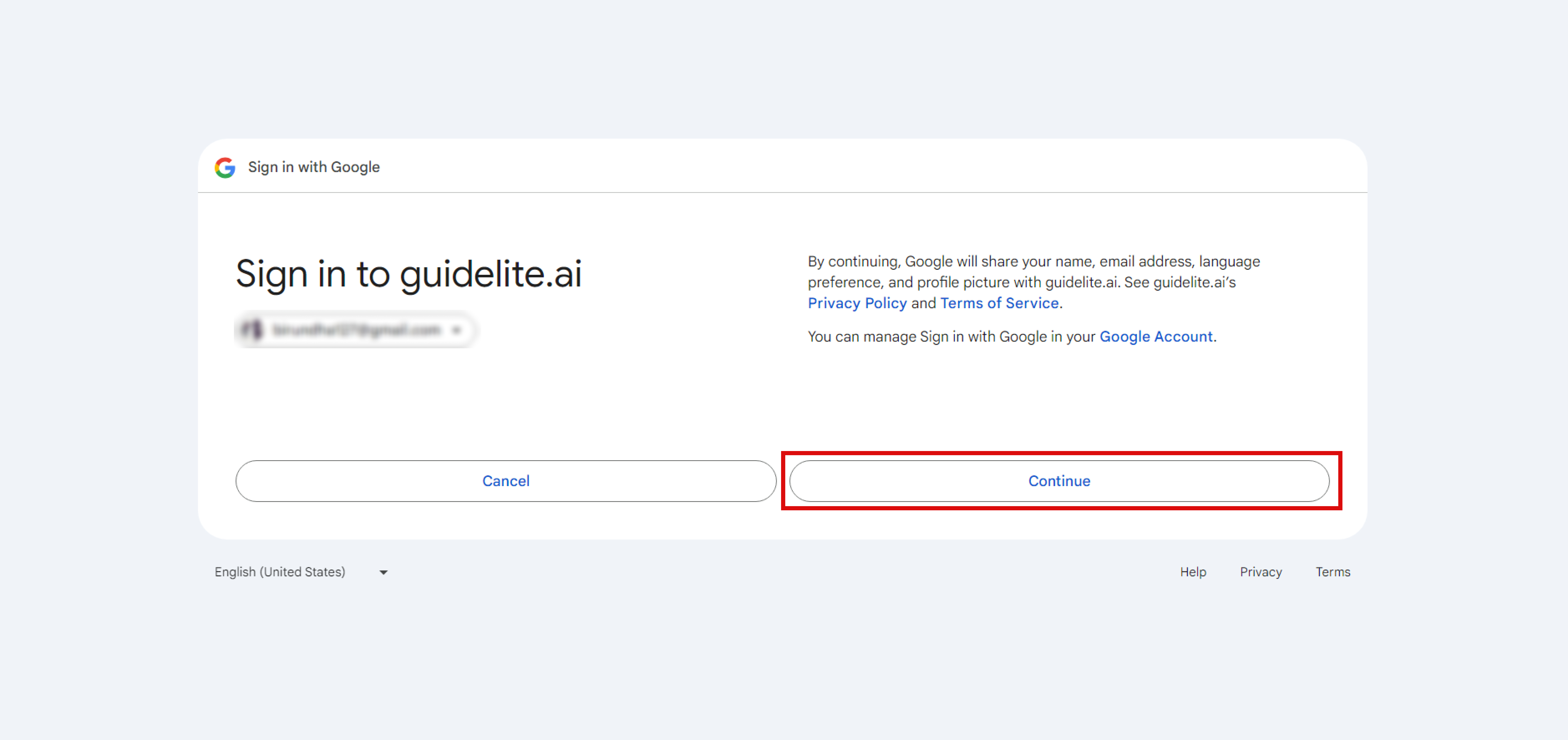 - Enter your Gmail username and password, then follow the on-screen instructions to grant GuideLite the necessary permissions.