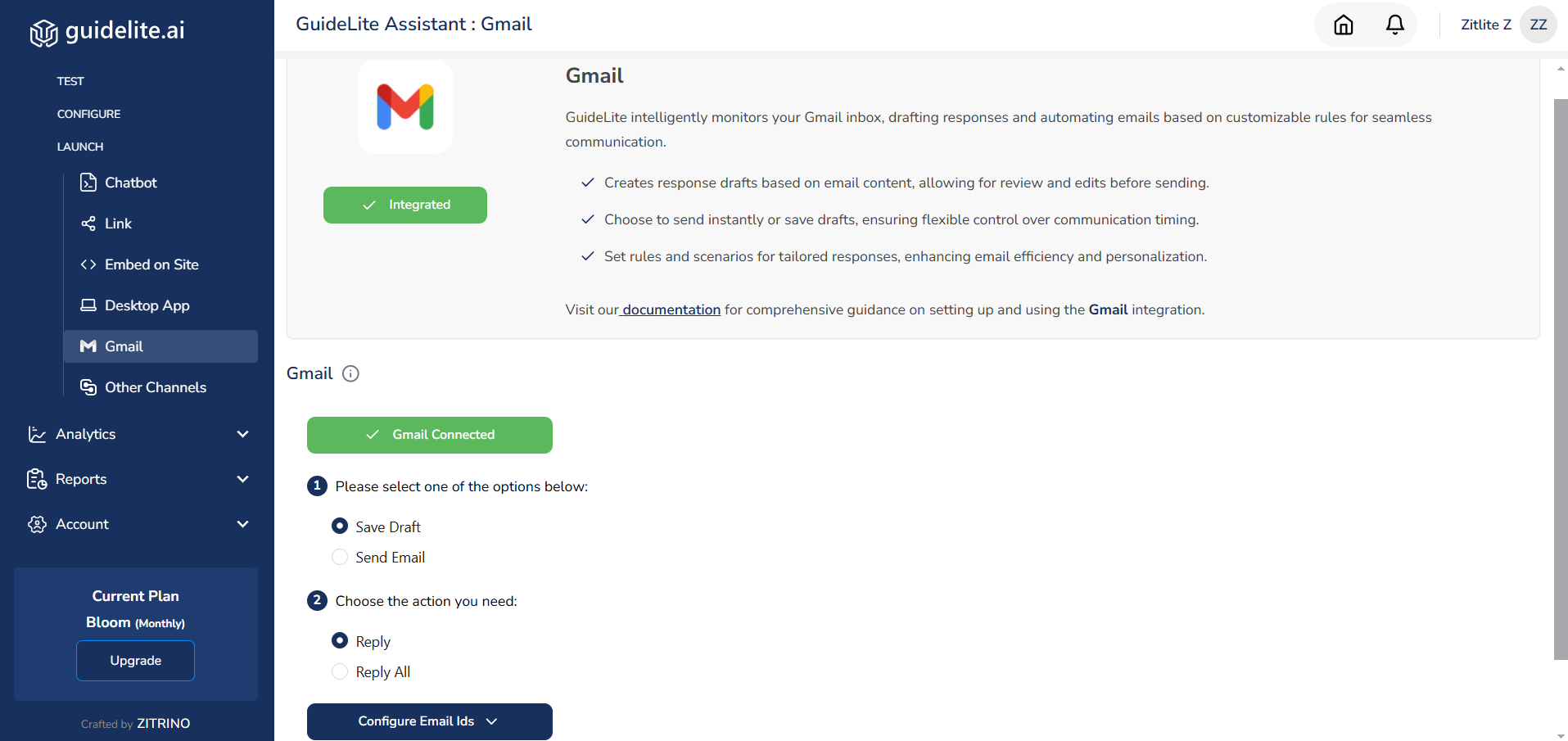 The Gmail integration with GuideLite allows you to manage your email communications effortlessly. Once integrated, GuideLite will watch your Gmail inbox for new emails and respond based on your preferences. You can choose to save responses as drafts or send them directly. This integration ensures that you stay on top of your communications with minimal effort.