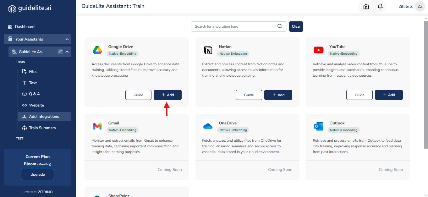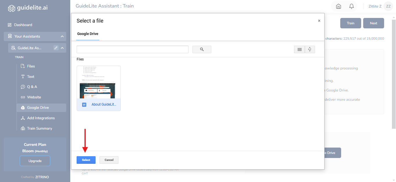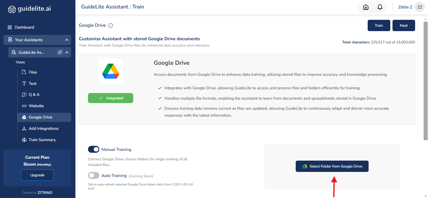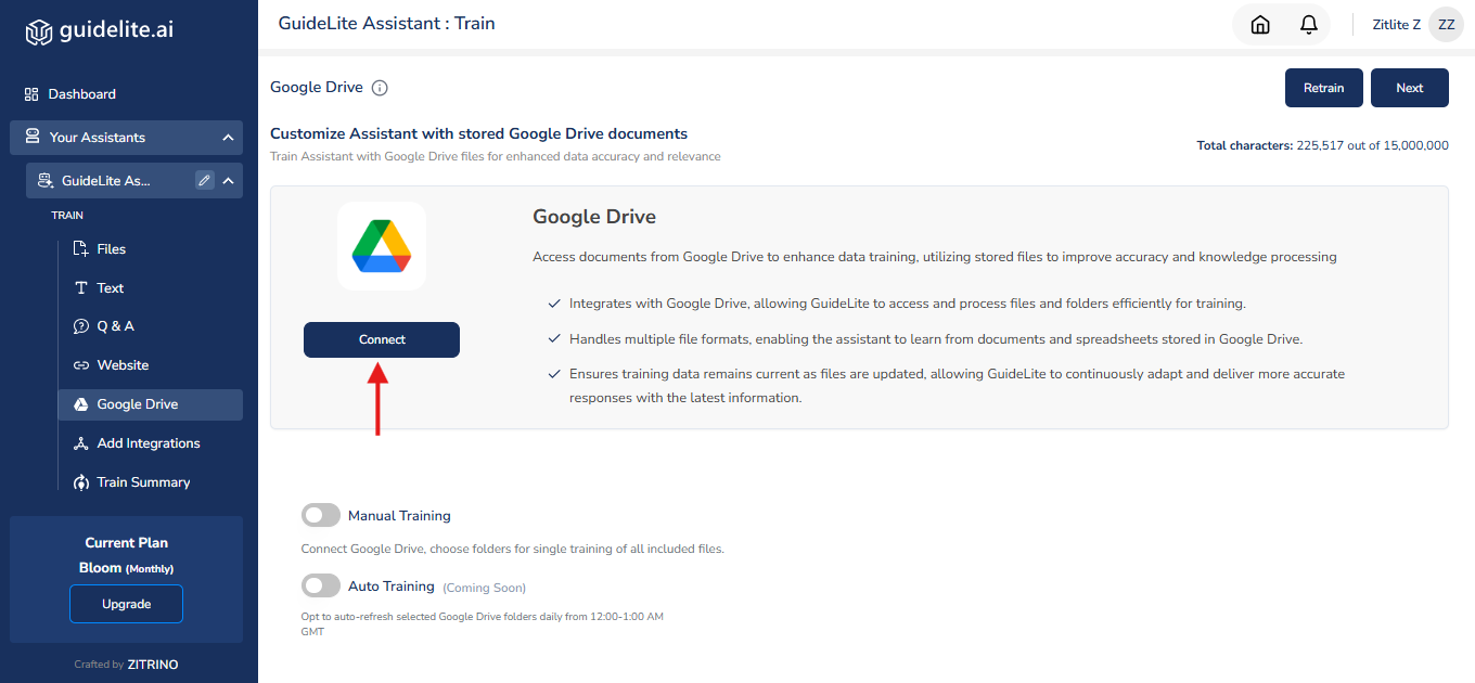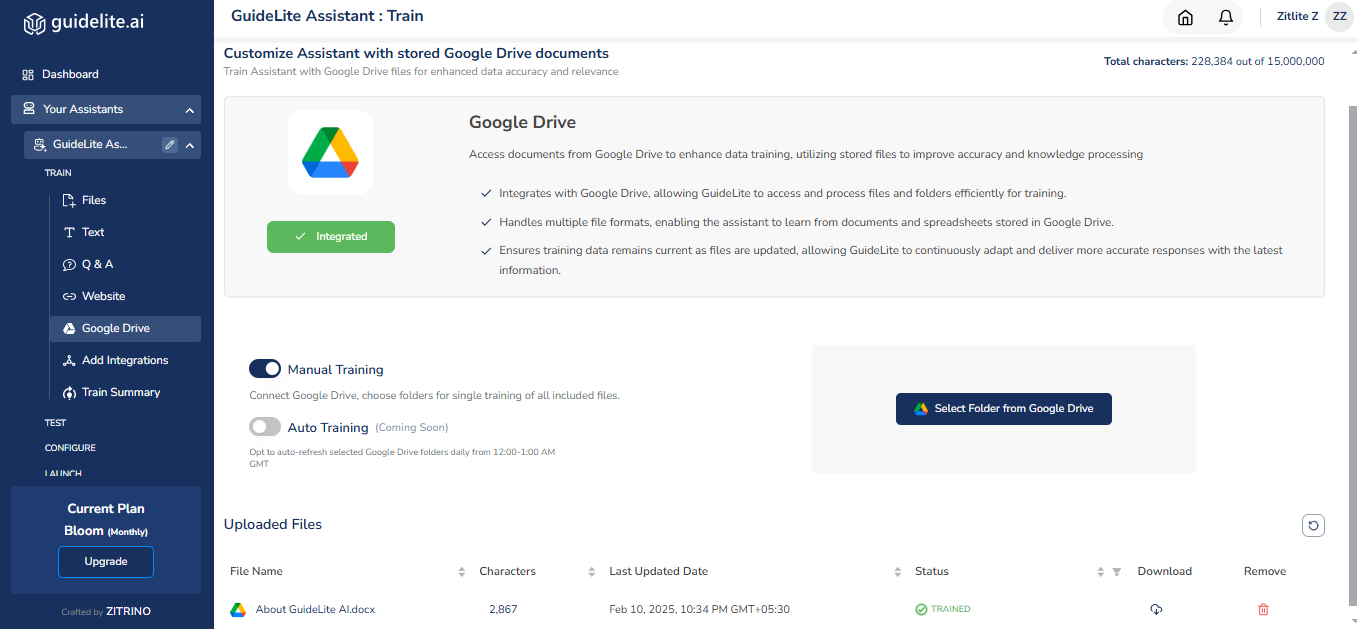 GuideLite allows users to connect to Google Drive, enabling them to upload data and train their Assistant.