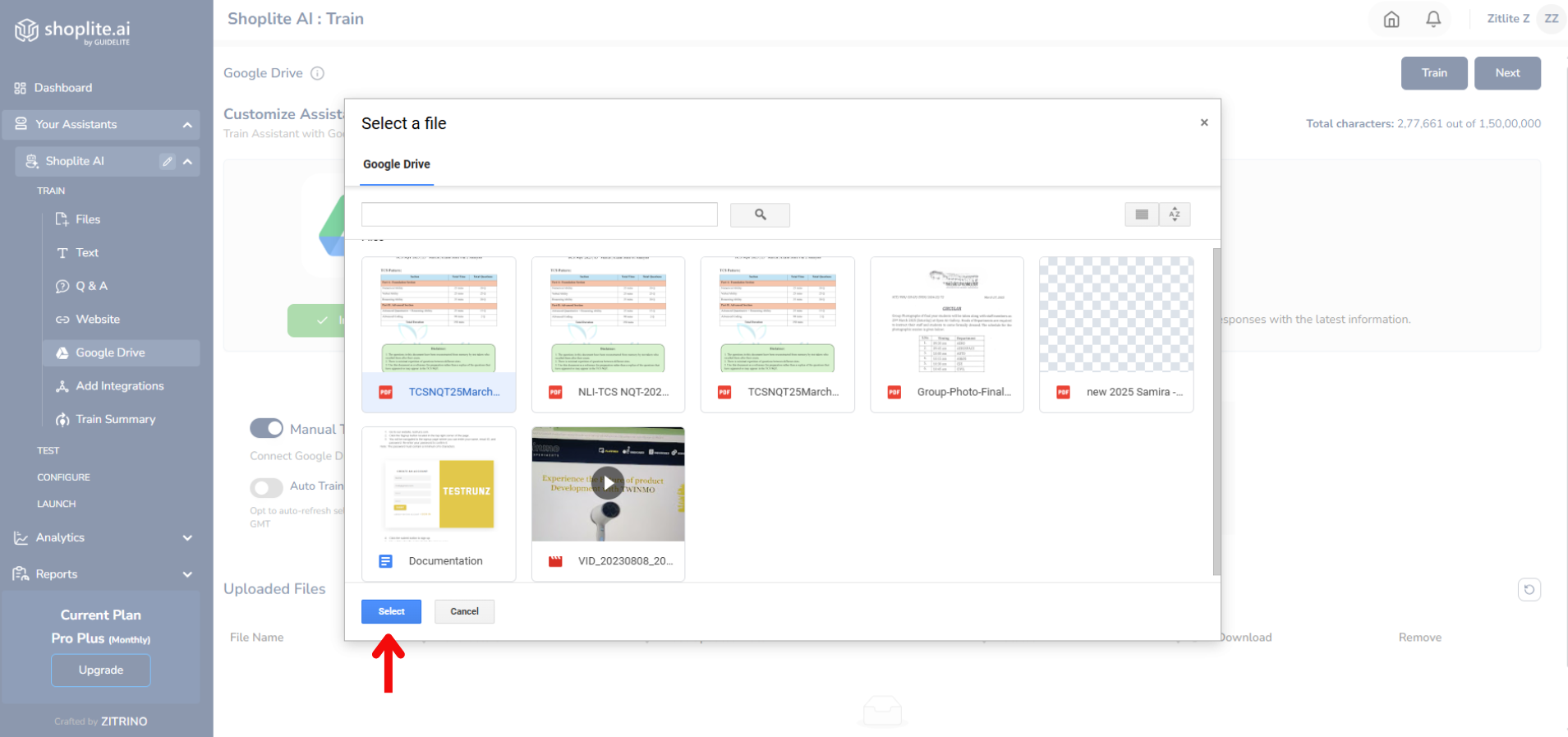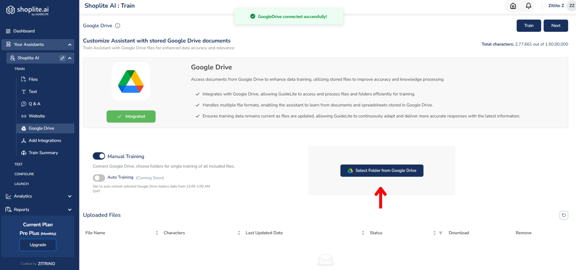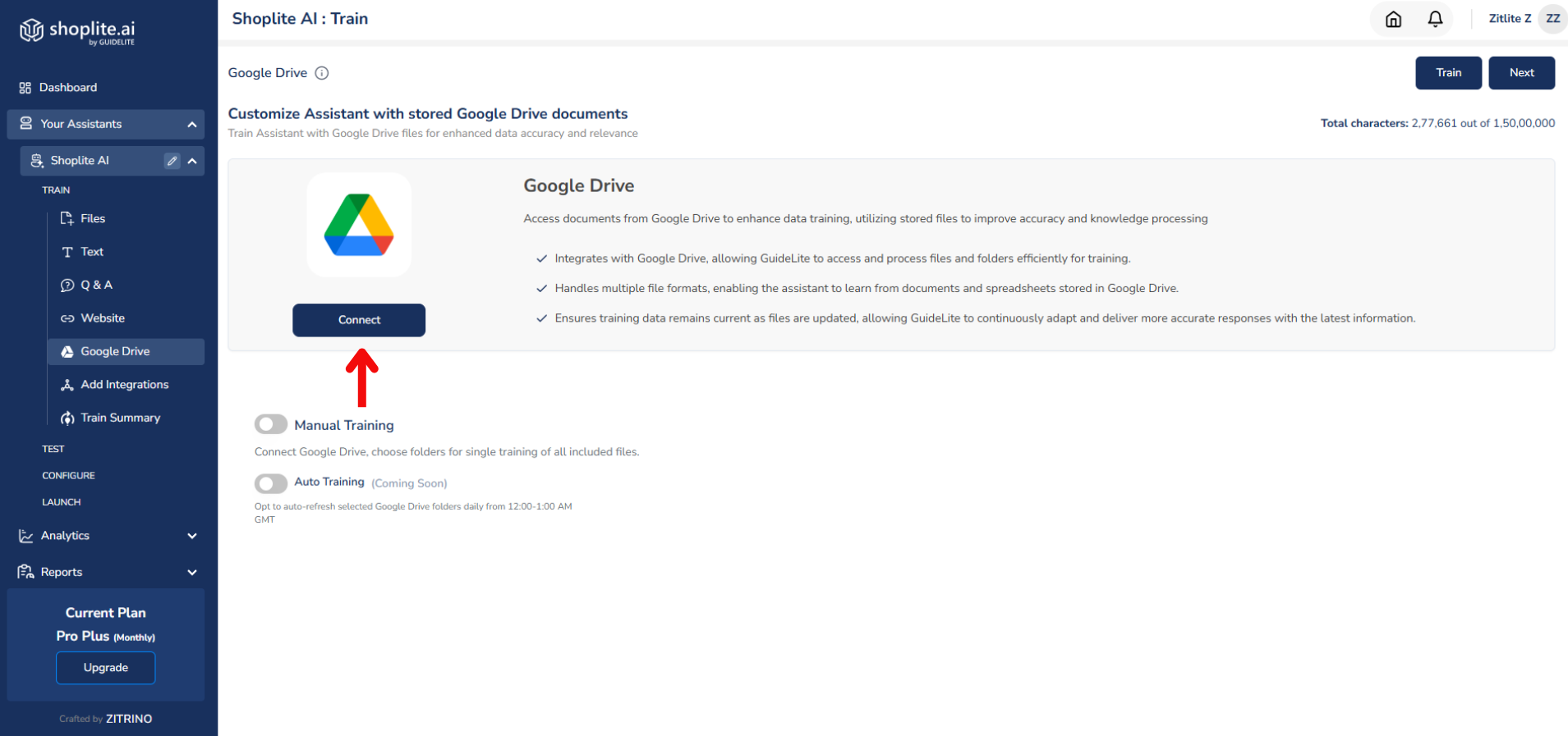 ShopLite allows users to connect to Google Drive, enabling them to upload data and train their Assistant.