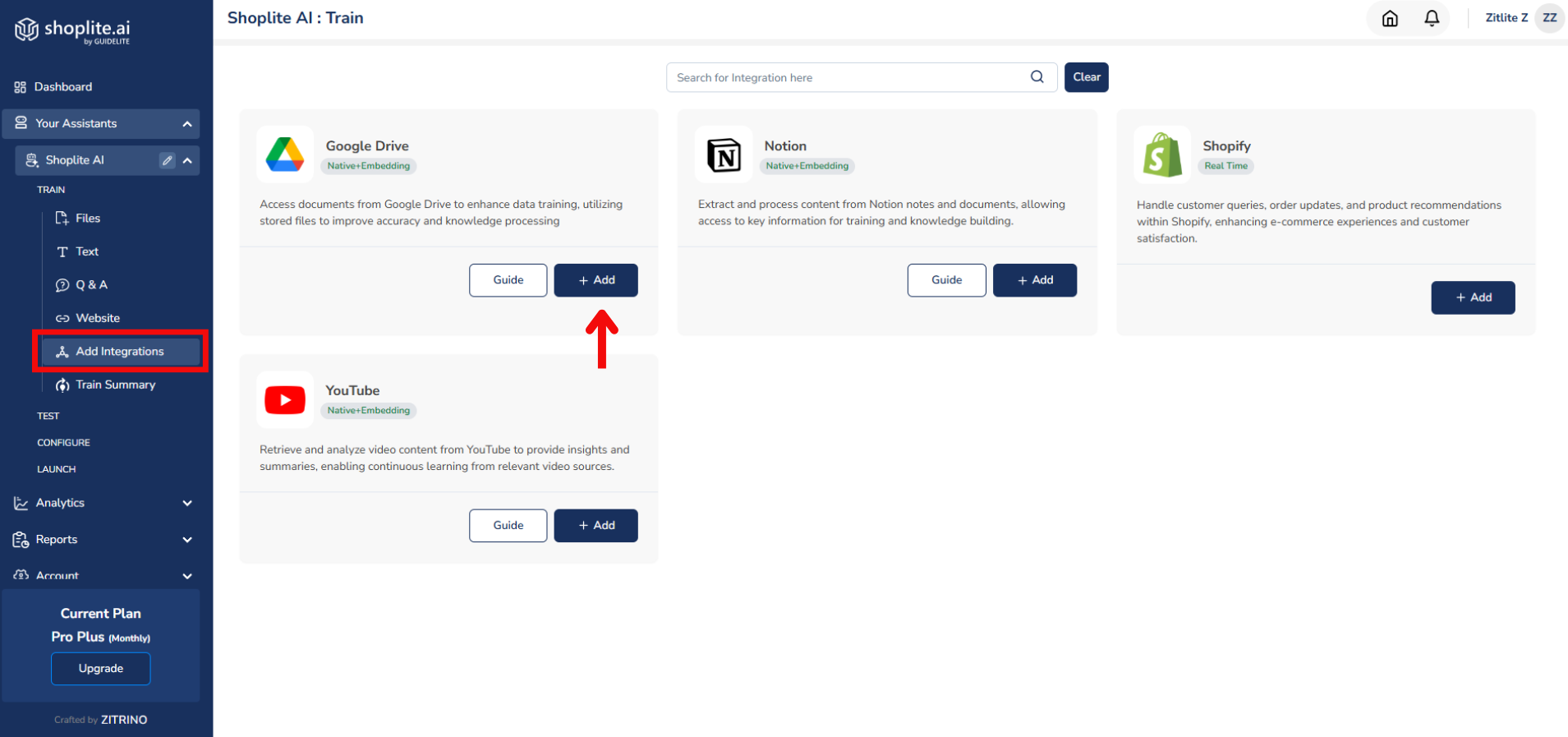 - Locate Add Integrations section and click on Add button of the Google Drive card.