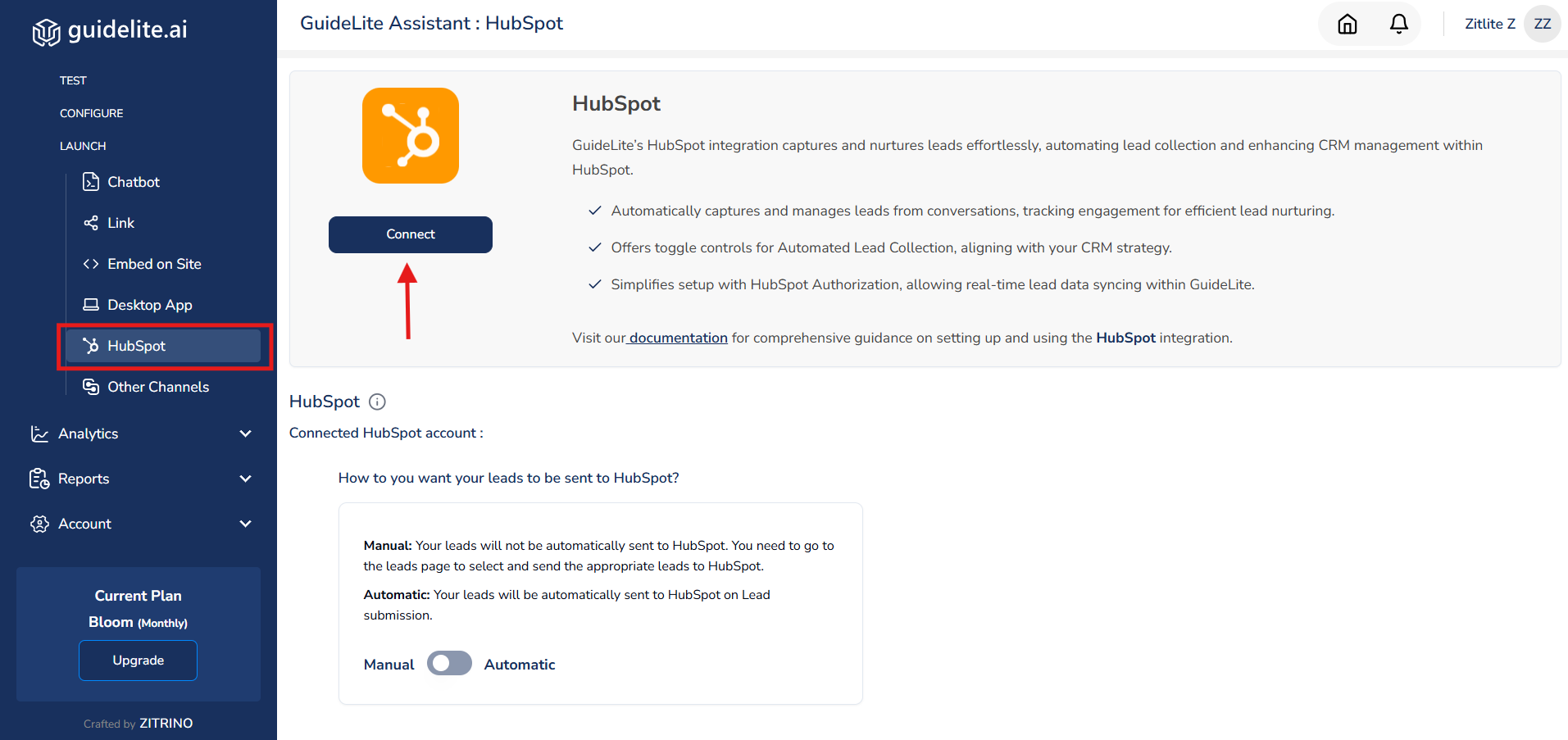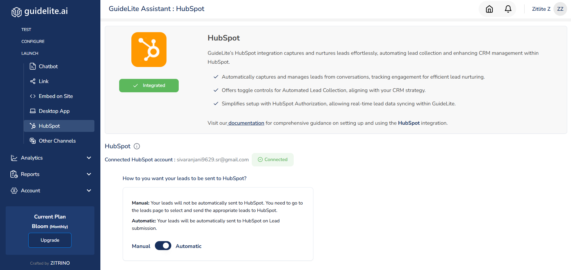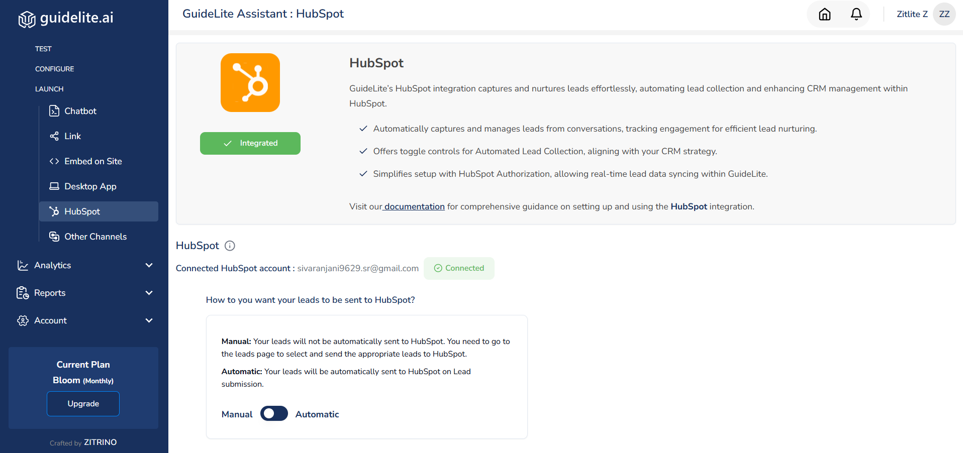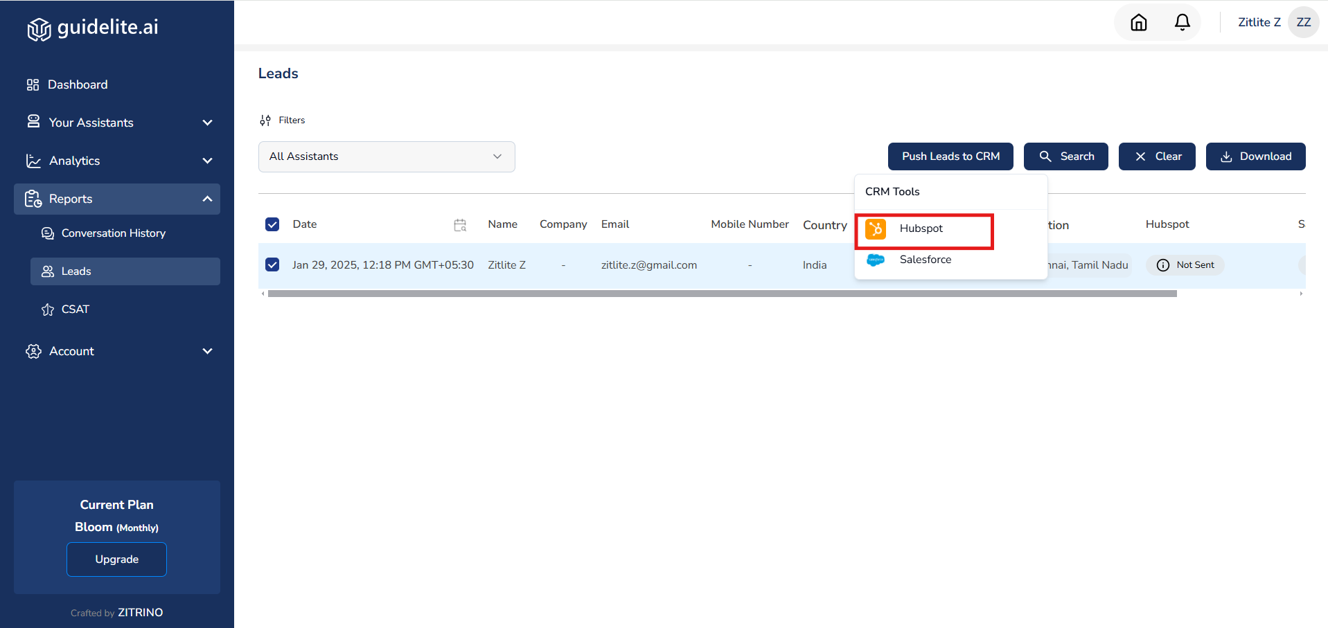 Whenever a lead is captured by your GuideLite Assistant on your website, you can push those leads to HubSpot, or they will be automatically added to HubSpot.