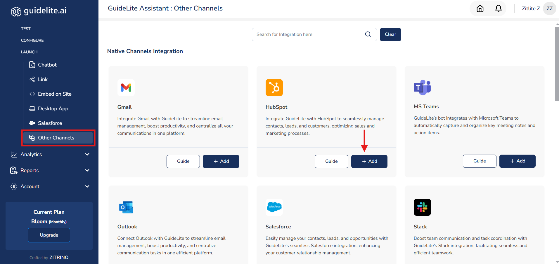 - In the Launch section, locate Other Channels and click the Add button on the HubSpot card.