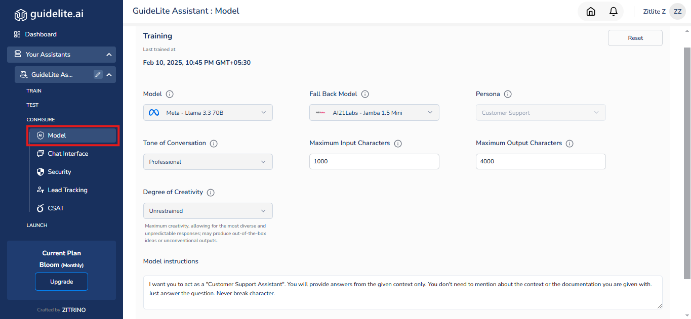 In this section, users can customize instructions, select an LLM model, Fall Back LLM model and adjust the temperature settings as desired.