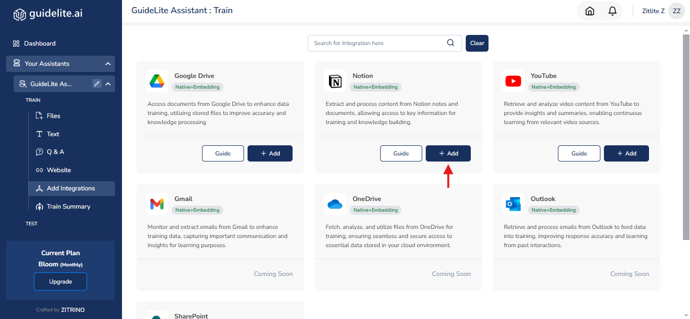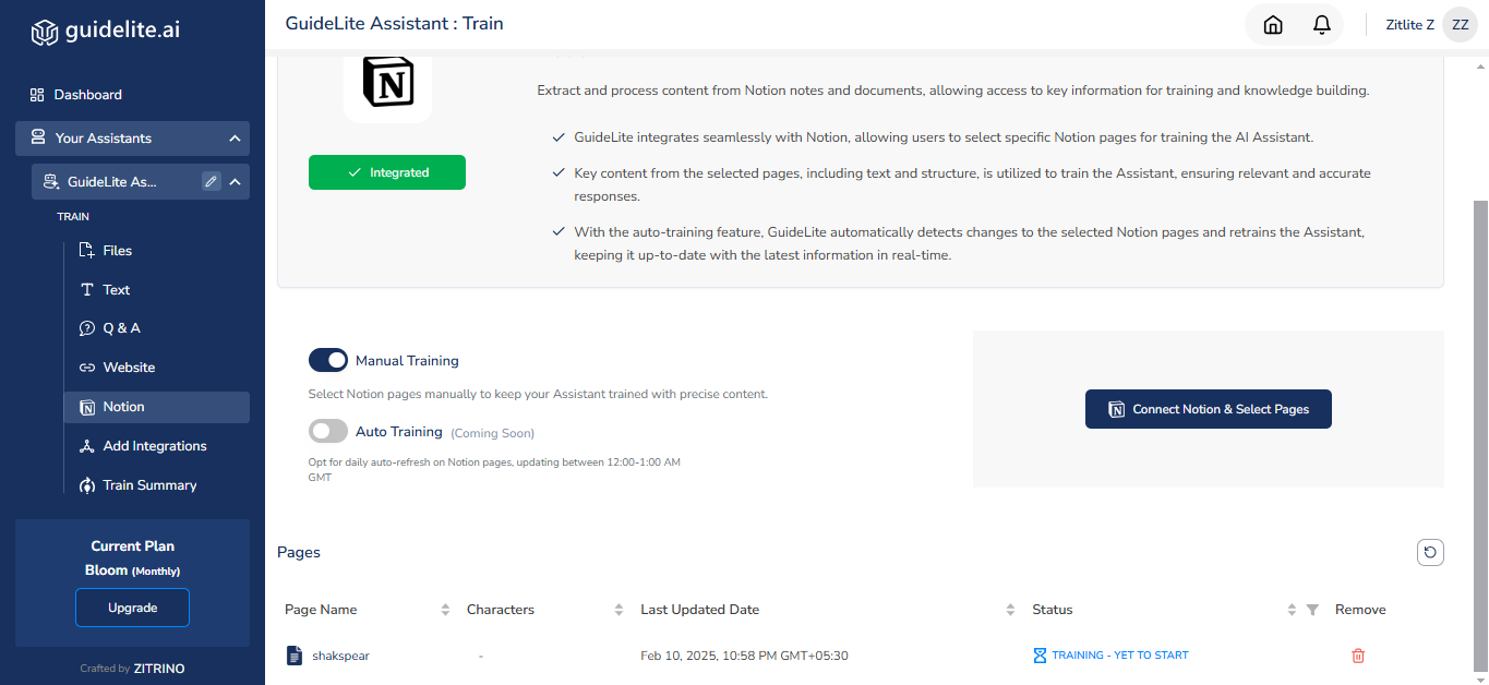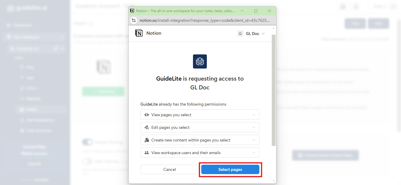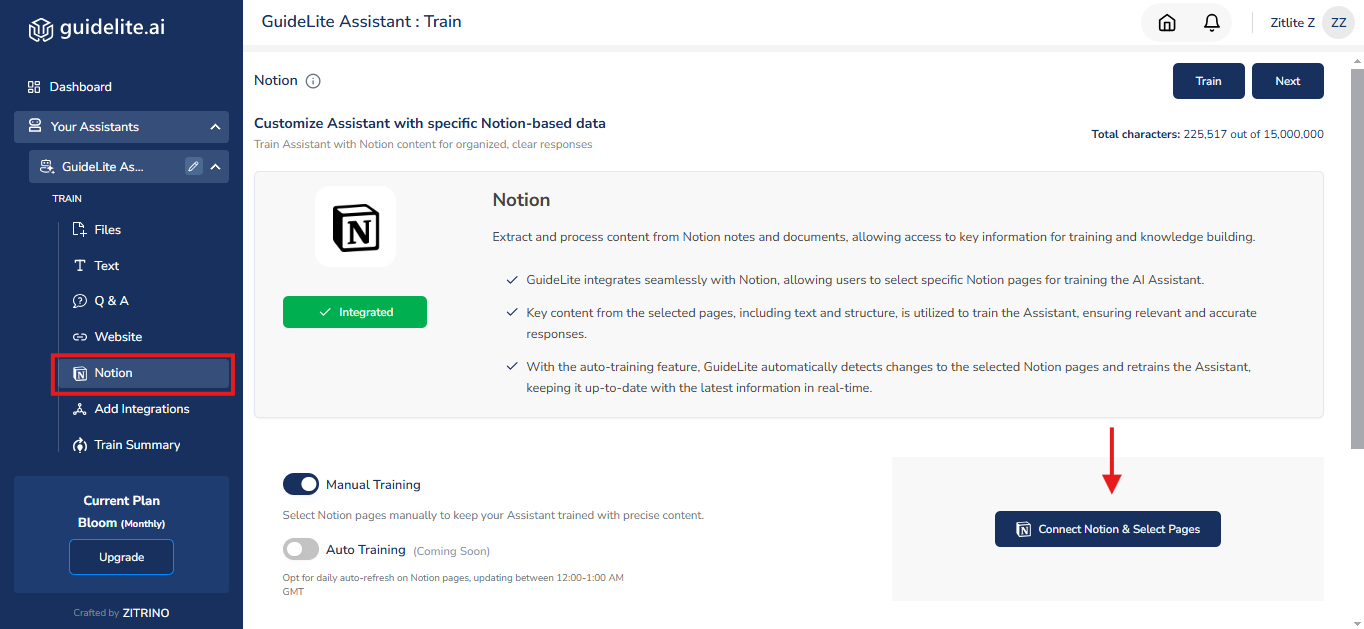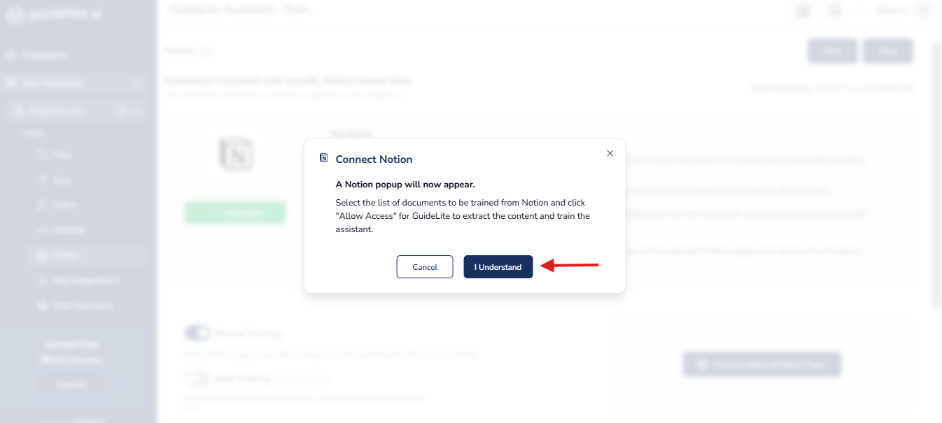 GuideLite allows users to connect to Notion, enabling them to upload data and train their Assistant.