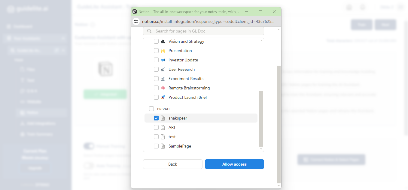Click Allow access to grant GuideLite permission to access your Notion pages.