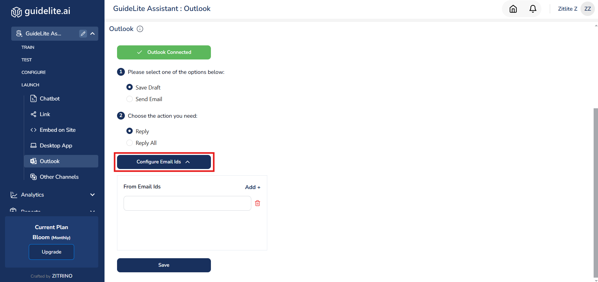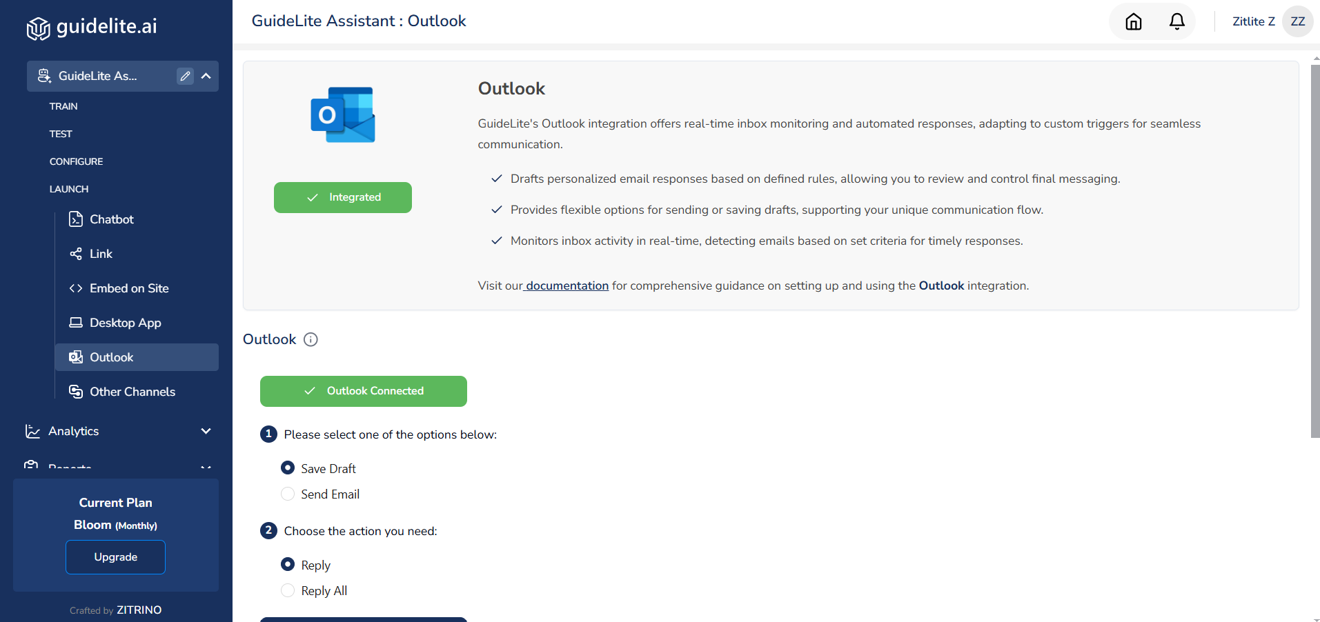 The Outlook integration with GuideLite allows you to manage your email communications effortlessly. Once integrated, GuideLite will watch your Outlook inbox for new emails and respond based on your preferences. You can choose to save responses as drafts or send them directly. This integration ensures that you stay on top of your communications with minimal effort.