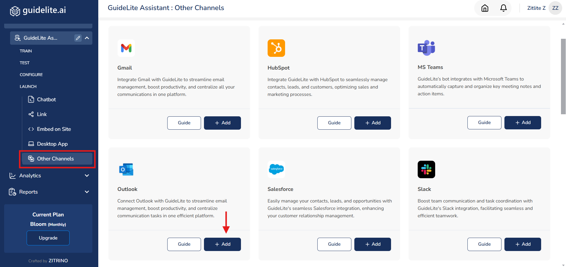 - In the Launch section, locate Other Channels and click the Add button on the Outlook card..