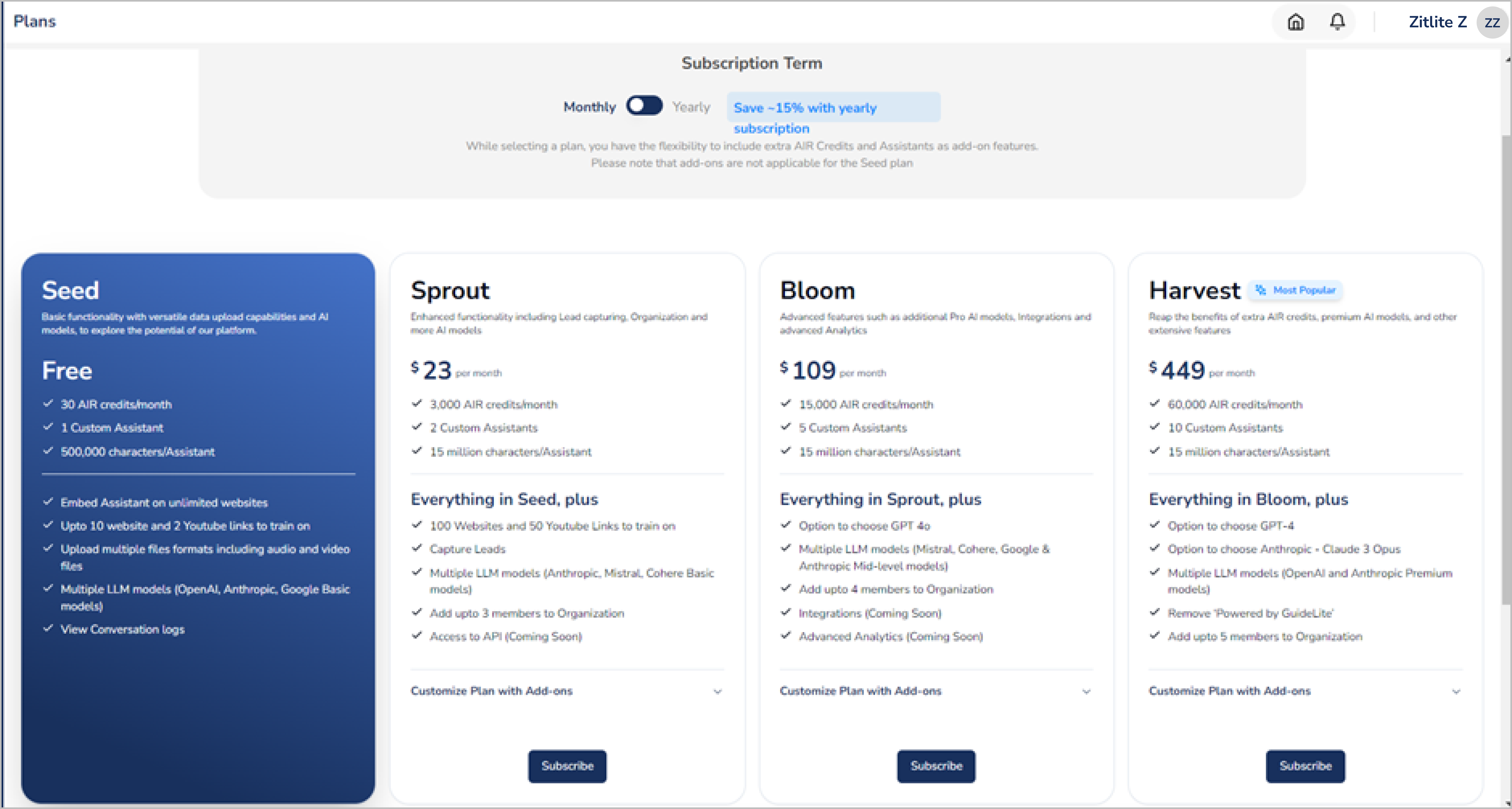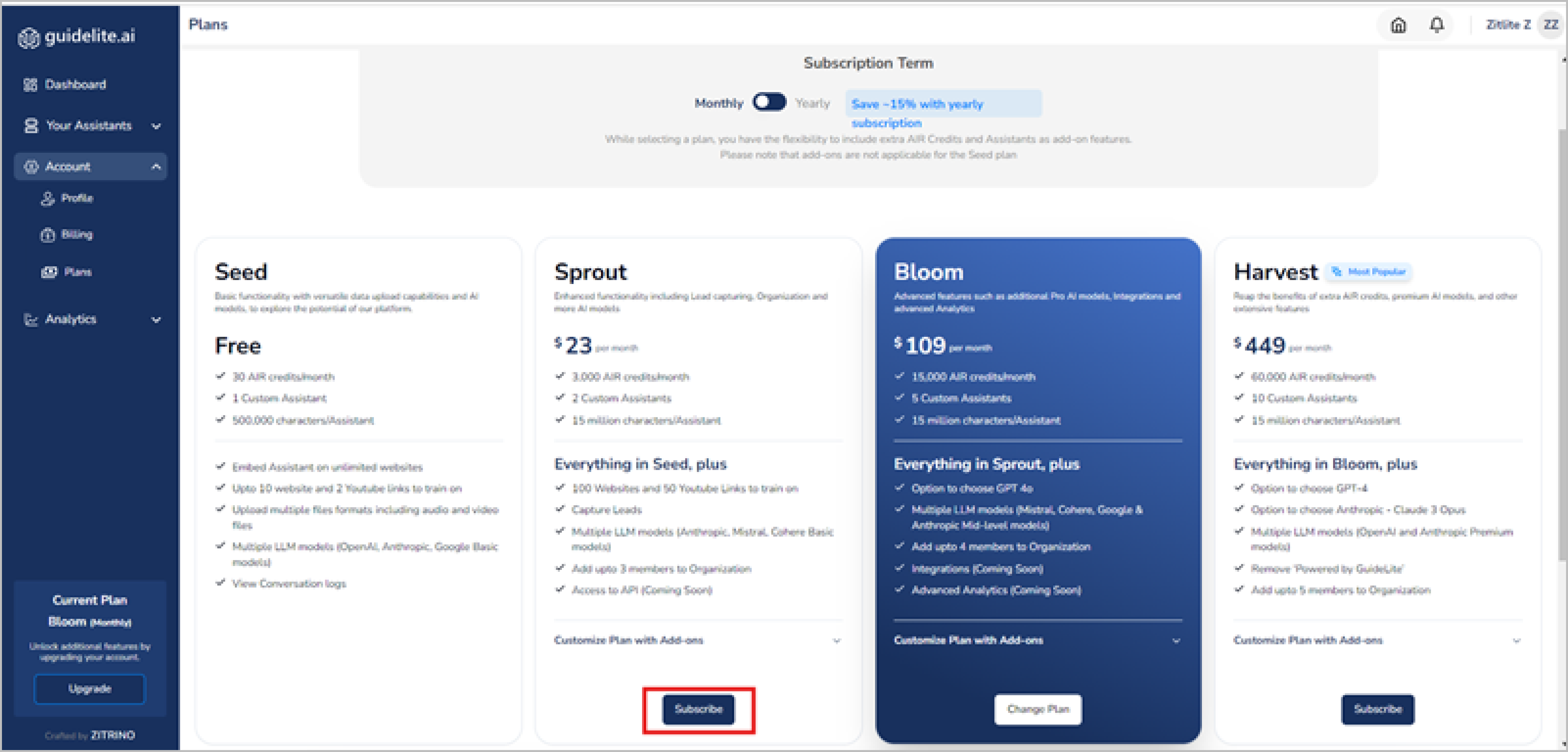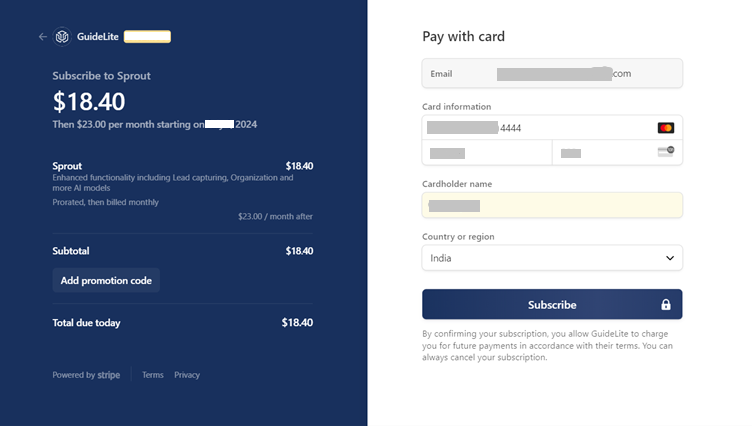Select your desired plan and click on the Subscribe button. You will then be redirected to a Stripe payment page.
