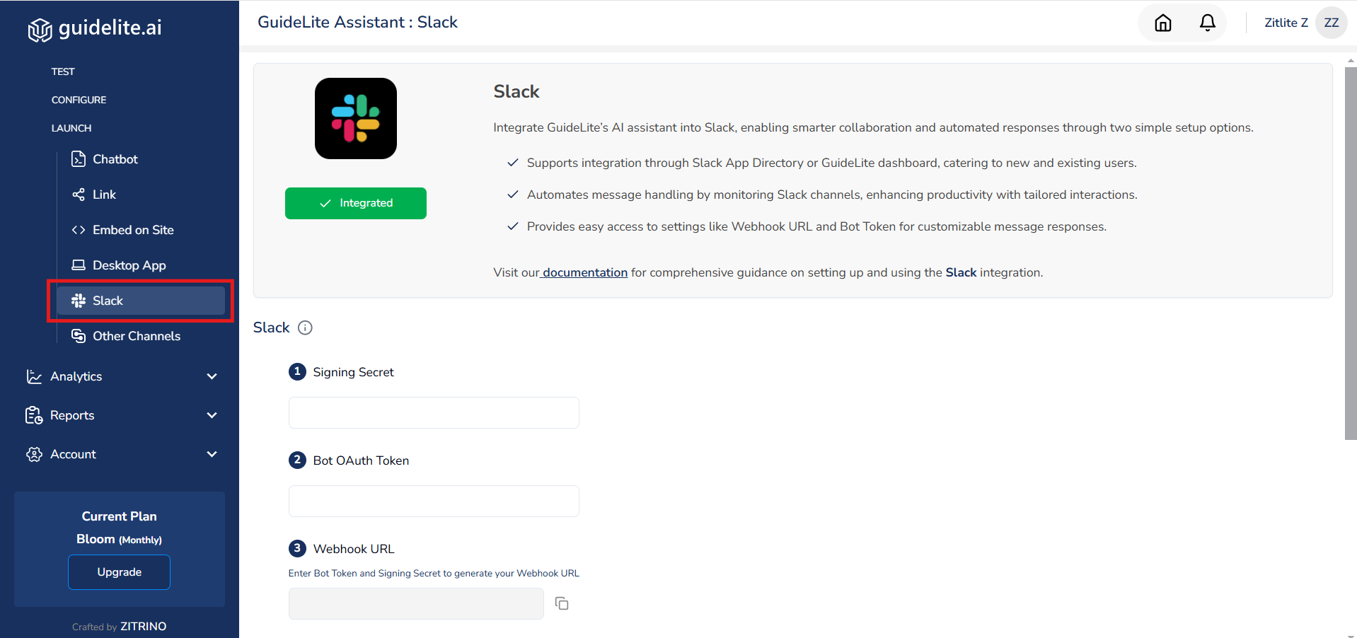 Paste the token into the Bot OAuth Token field in the Slack Integration Details Popup on your GuideLite Assistant section.