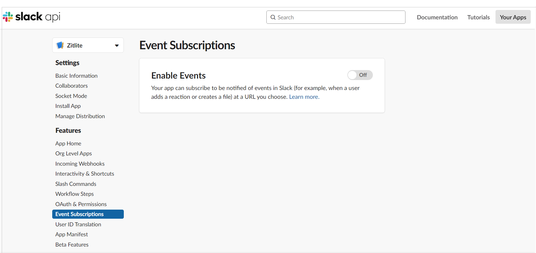 Navigate to Slack API dashboard to Create an App. Click on Your Apps located at the top right corner of the page.