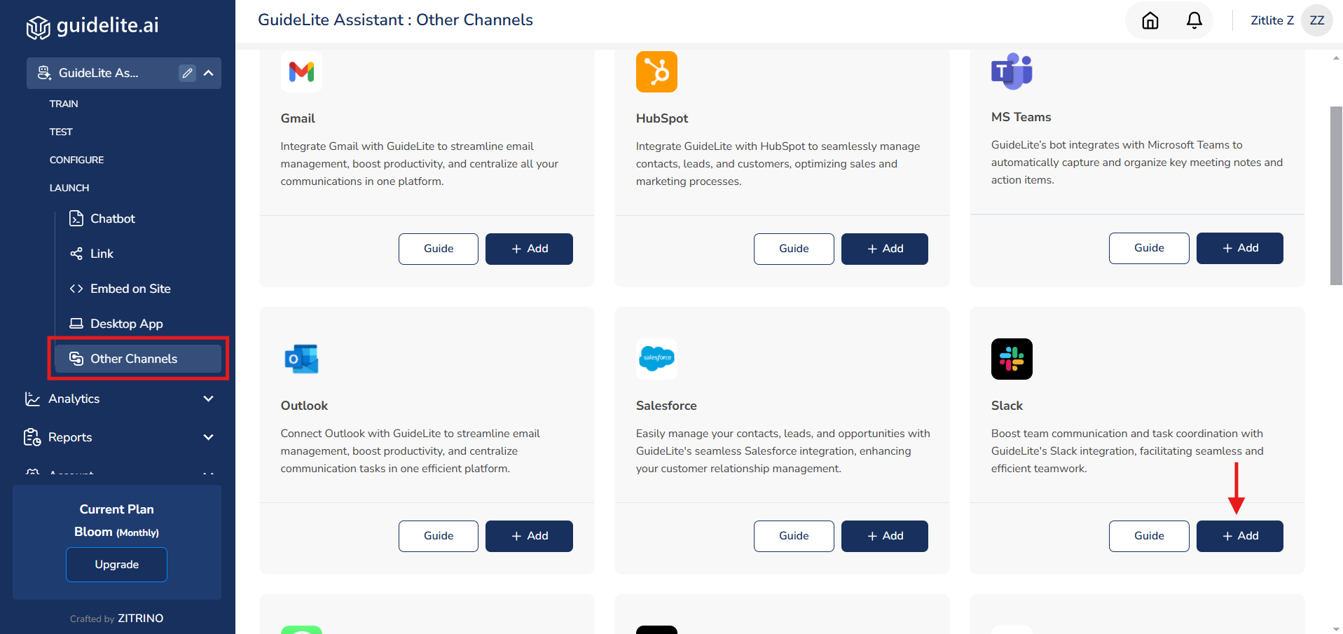 In the Configure section, locate Other Channels and click the Add button on the Slack card.