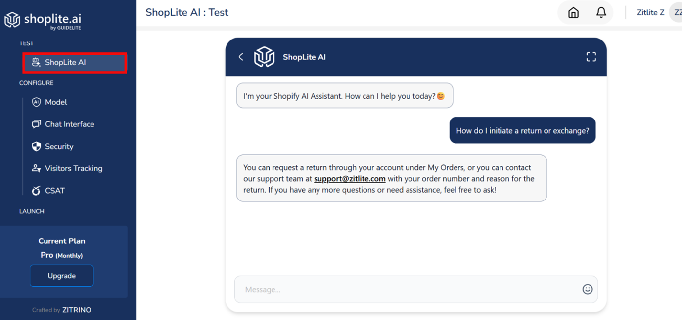 • Once your AI assistant is ready, test it by prompting it with a few questions.