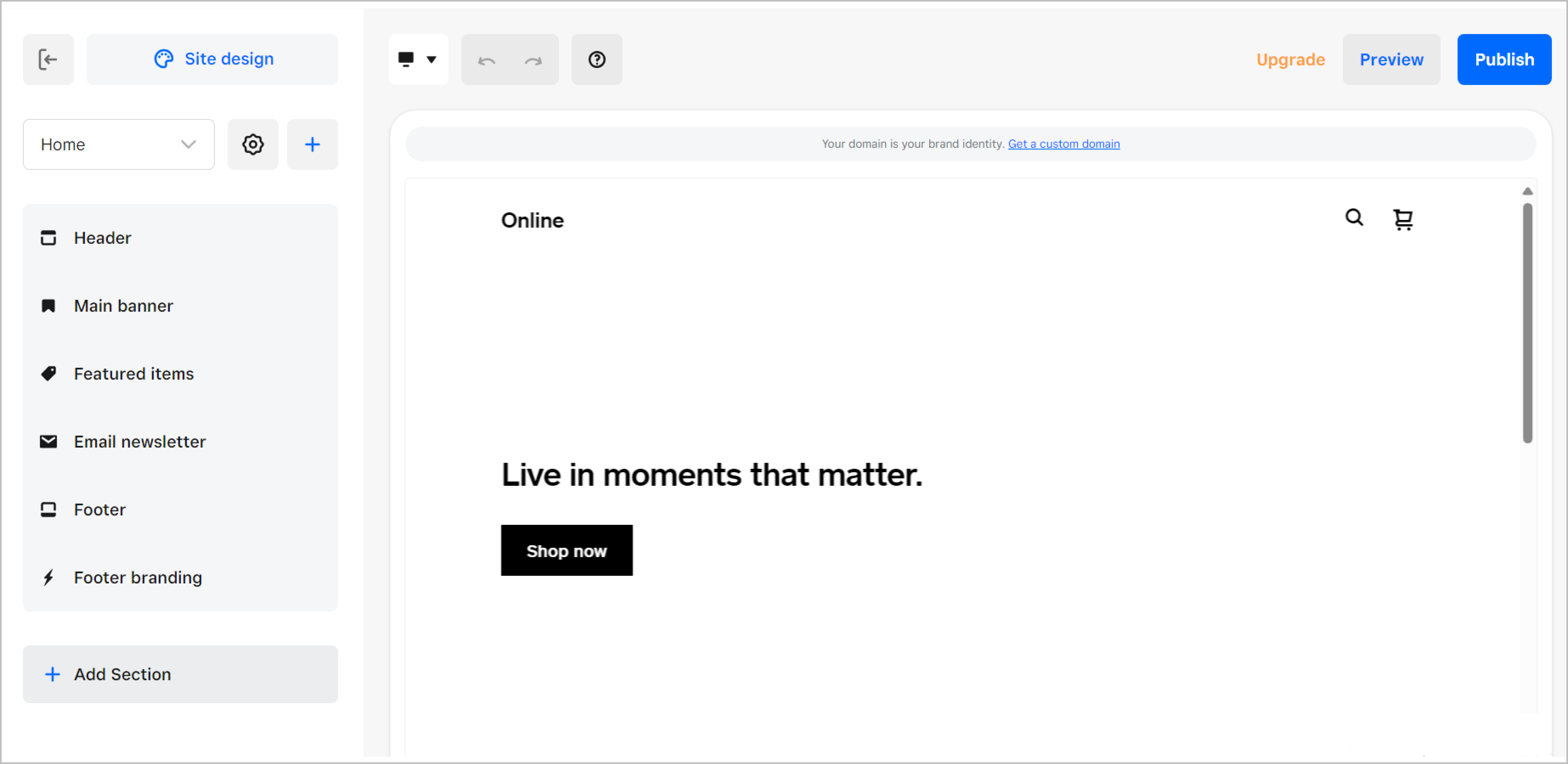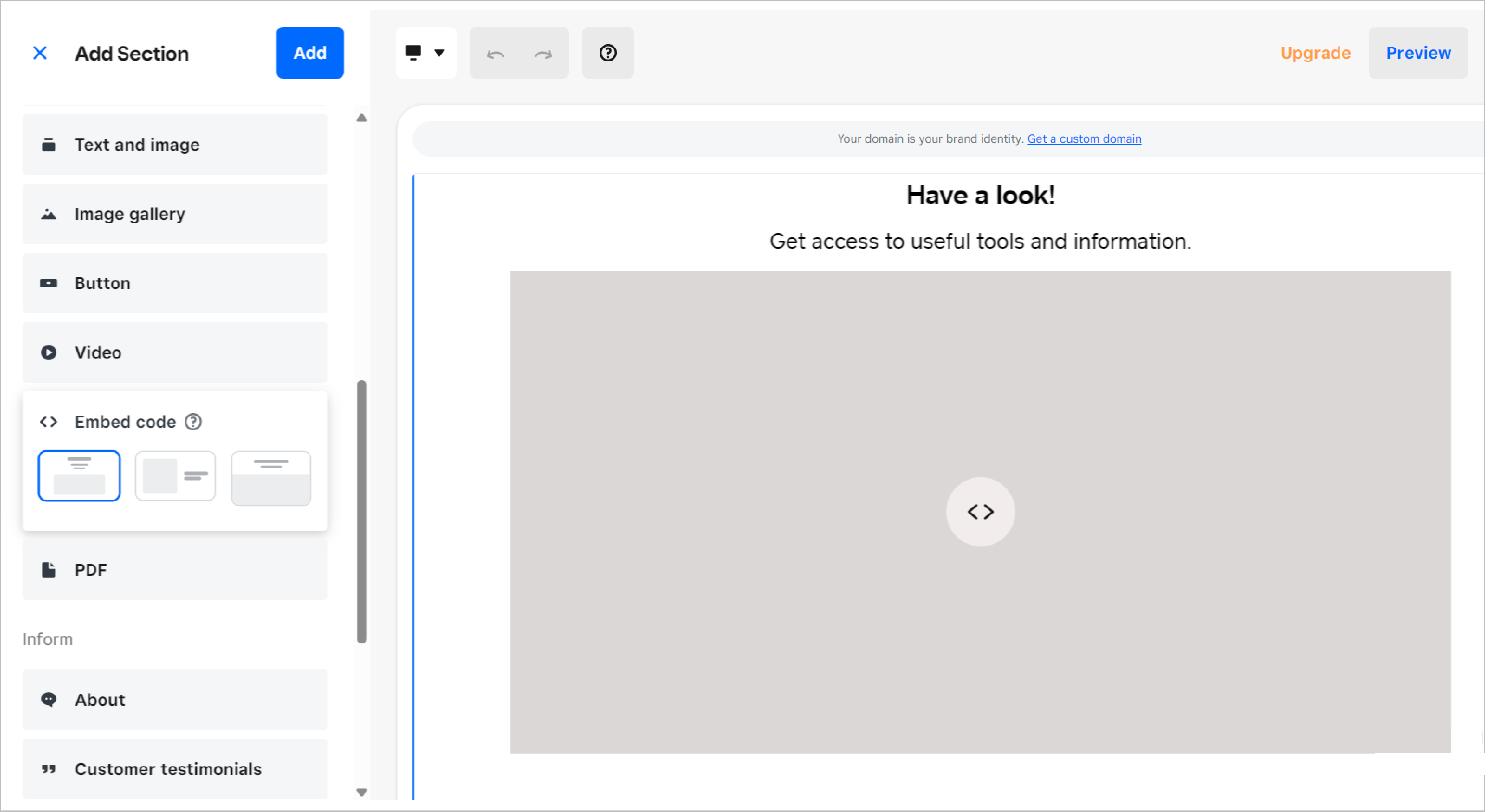 - In the Add section panel, scroll down to the Embed code section.