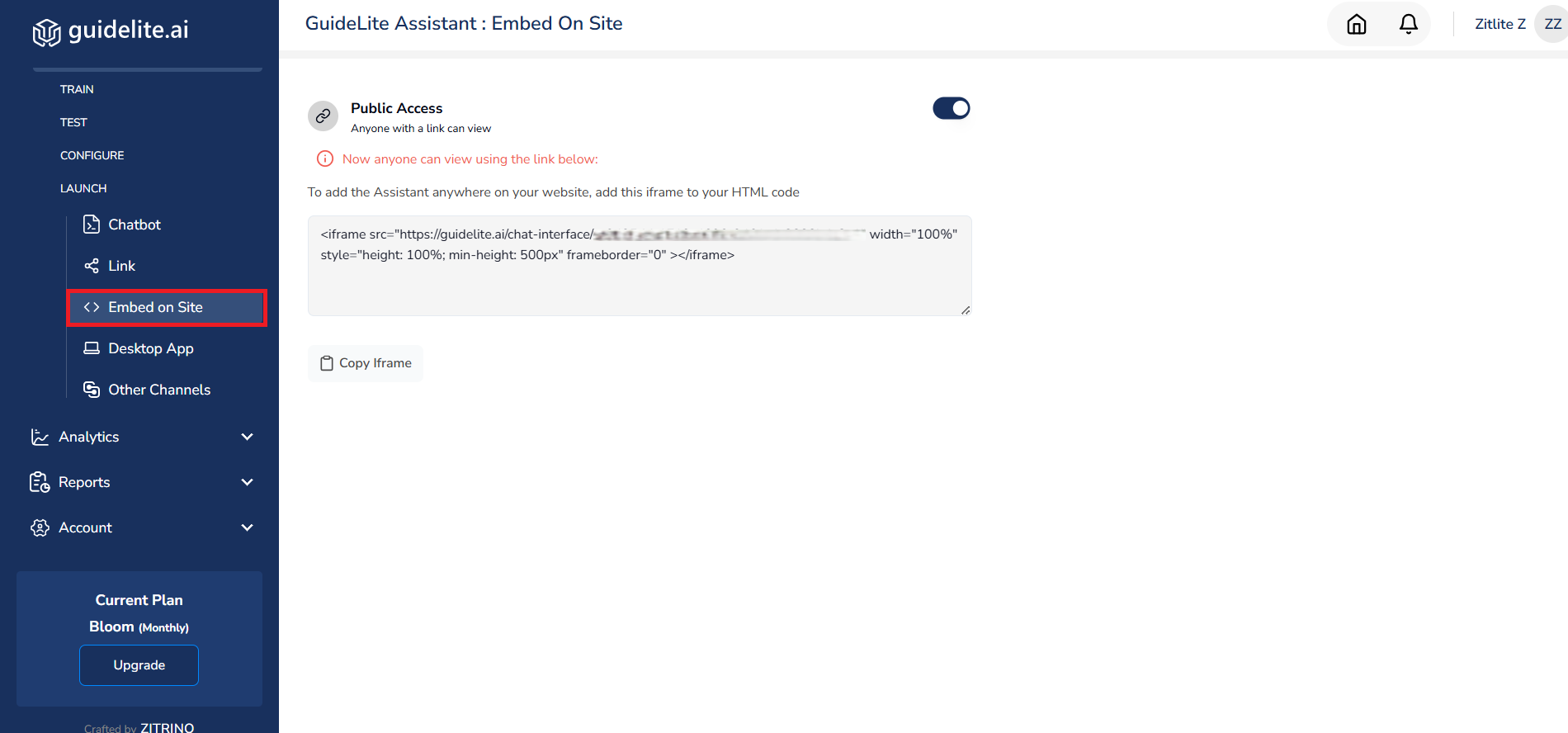 - Locate the Launch section of your assistant and click on the Embed on Site tab.