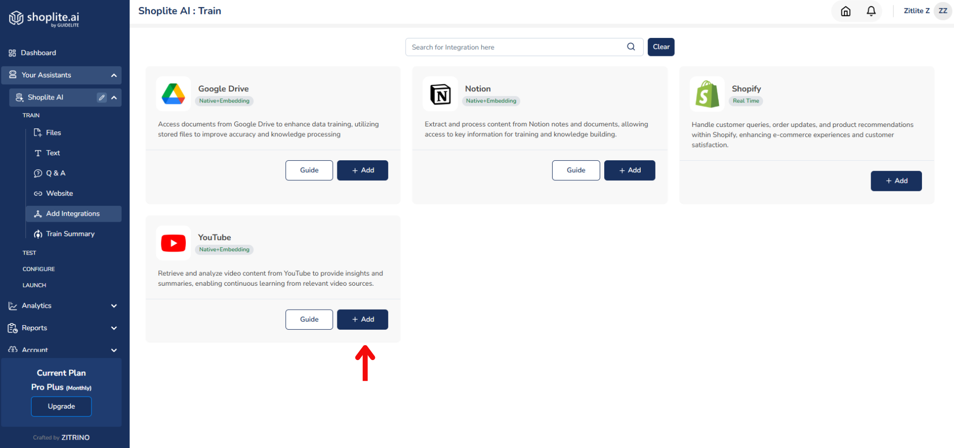 - Locate Add Integrations section and click on Add button of the YouTube card.