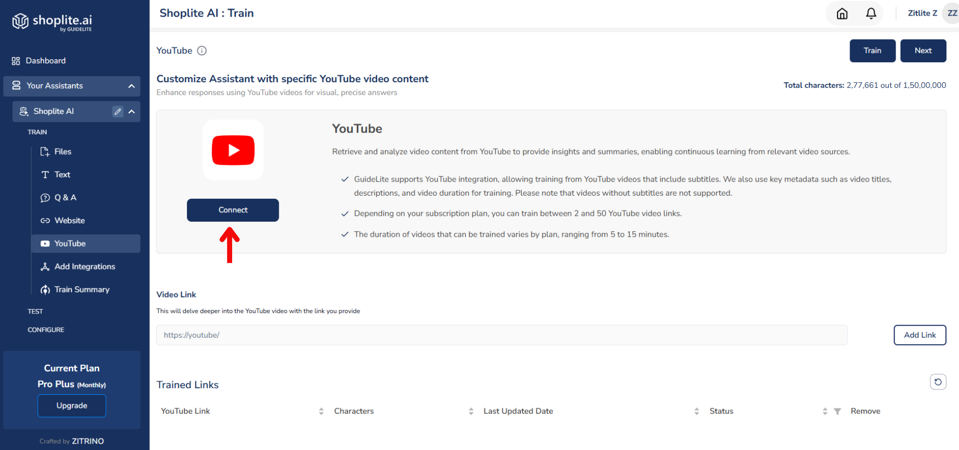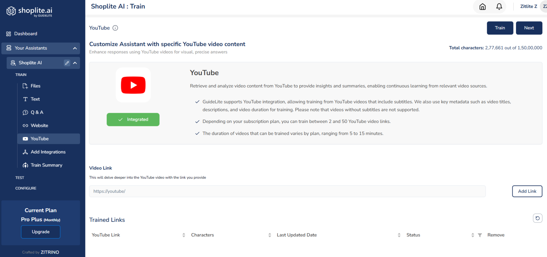 Connect and Train your Assistant using YouTube: ShopLite allows users to connect to their YouTube channel , enabling them to upload their channel youtube link and train their Assistant.