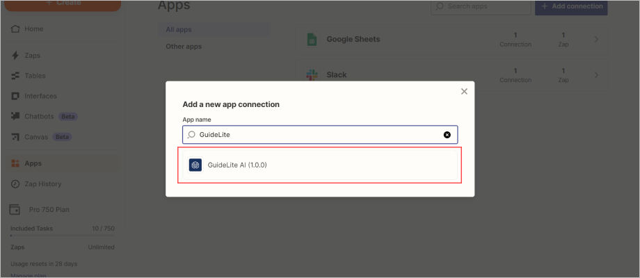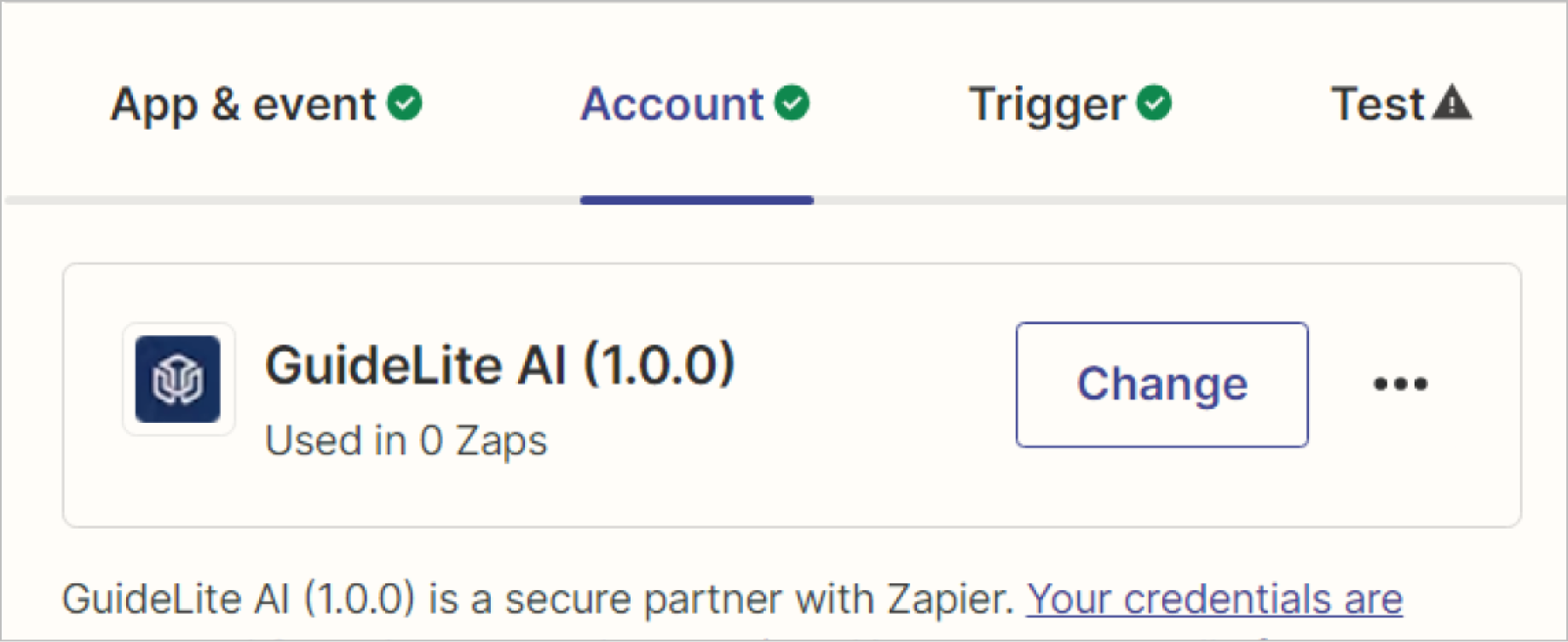 - Once the connection is successful, your GuideLite account will be added to Zapier.