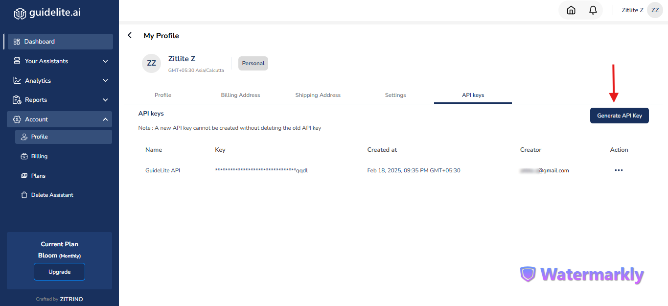 - To generate a key, go to your Account Settings in GuideLite and click the API Keys tab.